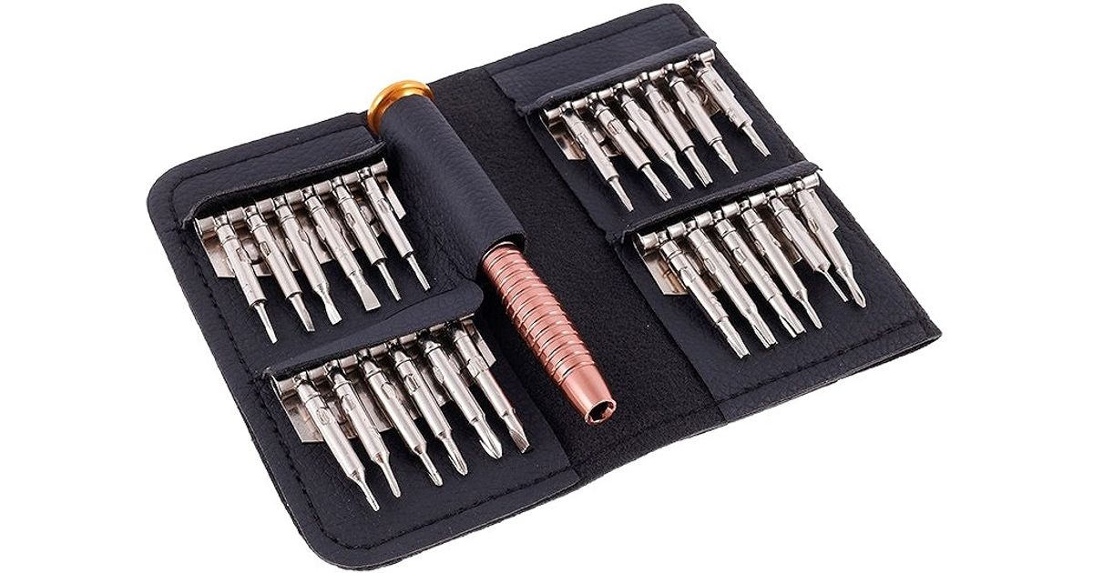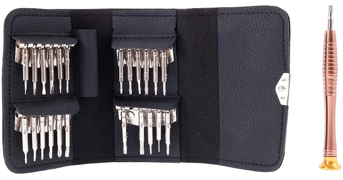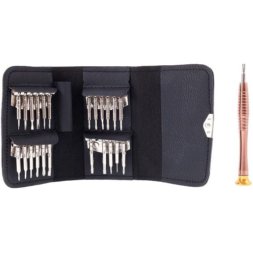Vahetatavate otsikutega kruvikeeraja komplekt enamiku väikeste seadmete hooldamiseks ja parandamiseks. Komplekt on mugavas nahast vutlaris.