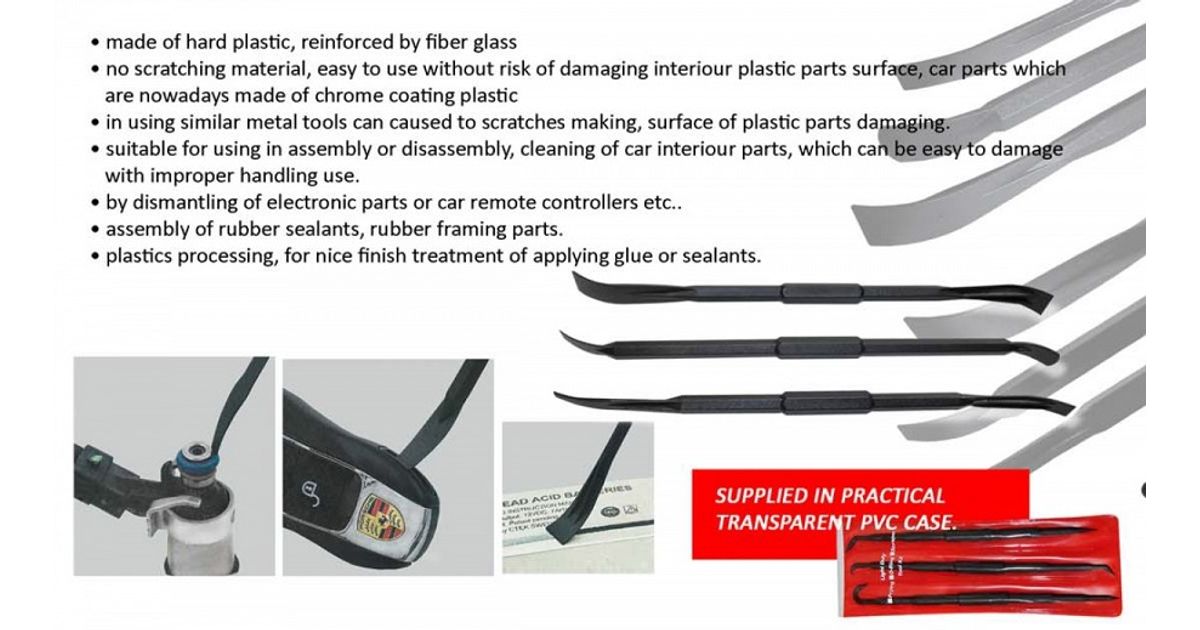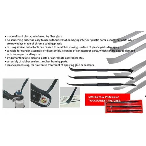 Valmistatud tugevast klaasfiibriga tugevdatud eriplastikust. Eeliseks sarnaste metalltööriistade ees on. et ei kriibi ja ei jäta jälgi kergelt vigastatavatele pindadele (plastikpinnad. kroomiga kaetud plastikpinnad. värvitud pinnad jne). Sobivad salongi- või kerepaneelide eemaldamiseks. elektroonikaosade osandamiseks. kummimansettide ohutuks eemaldamiseks ja paigaldamiseks. vahede ja ja liimühenduste viimistlusel ja puhastamisel. Kuus erinevat otsikutüüpi.