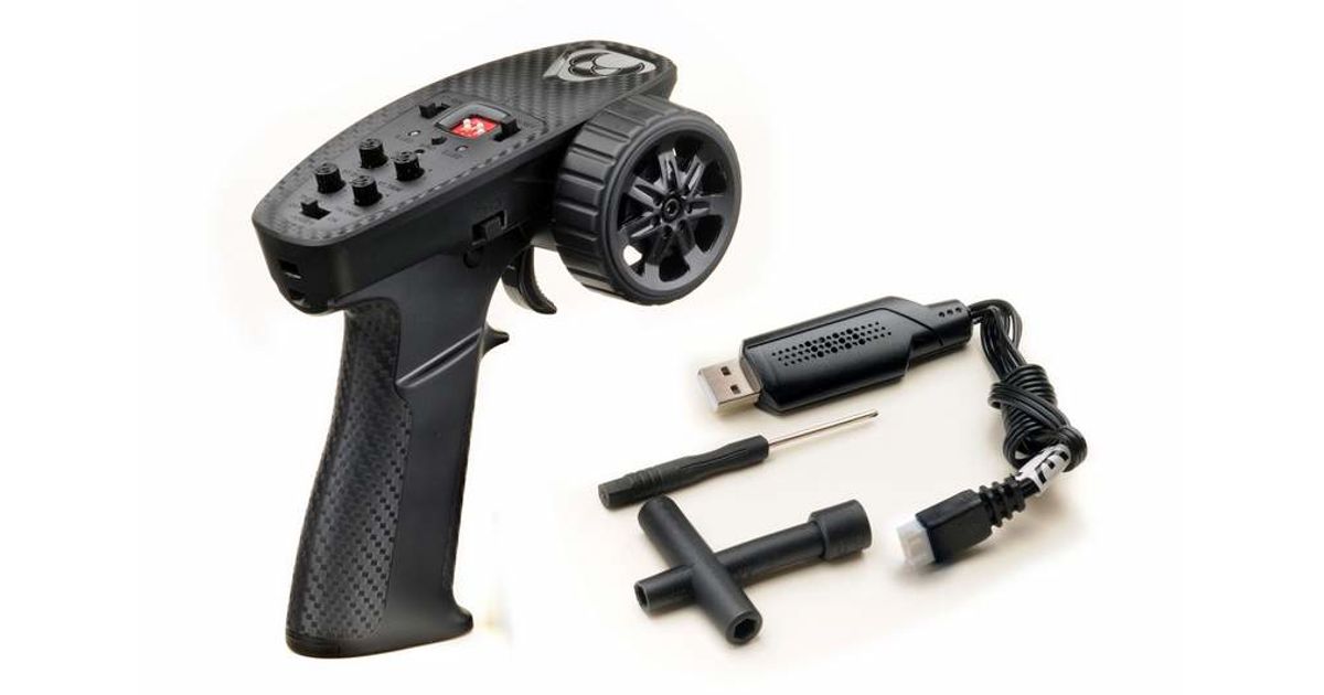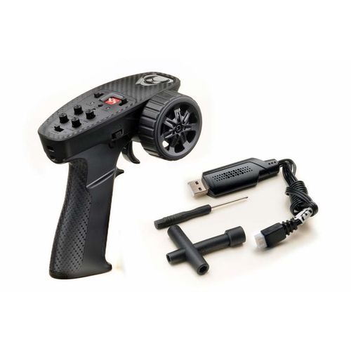 The vehicle is powered by a waterproof (PPX4) 2-in-1 speed controller/receiver unit and a 7.4V LiPo battery with 600mAh which provides a driving time of up to 60 minutes. The battery is charged by a USB charging cable. The charging time is about 45 minutes.