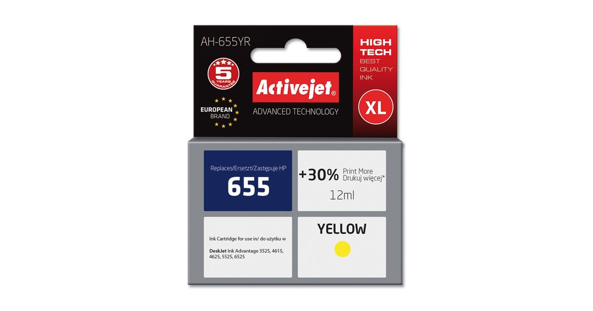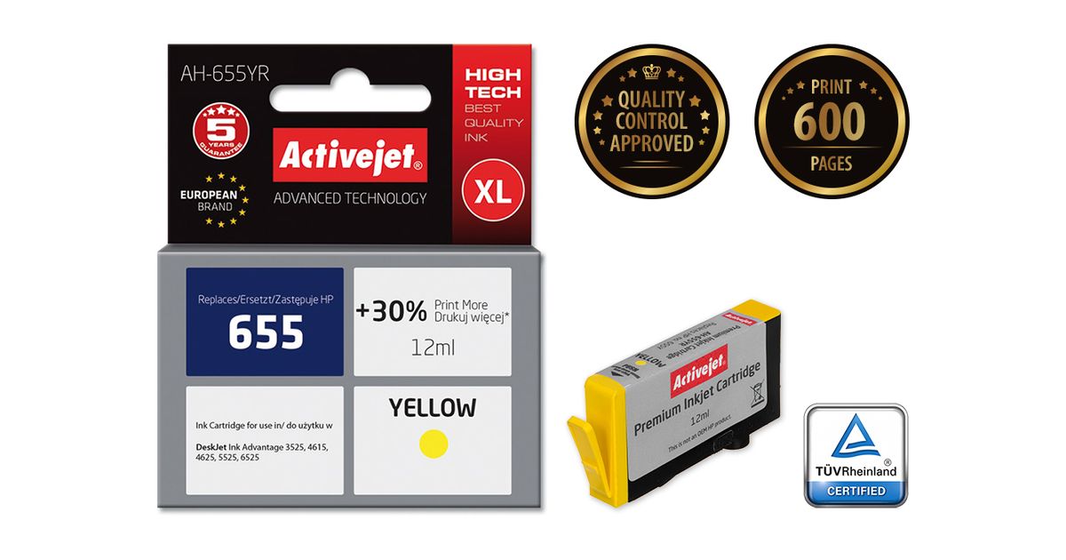 Activejet AH-655YR ink for HP printer; HP 655 CZ112AE replacement; Premium; 12 ml; yellow, High (XL) Yield, Pigment-based ink, 12 ml, 600 pages, 1 pc(s)
