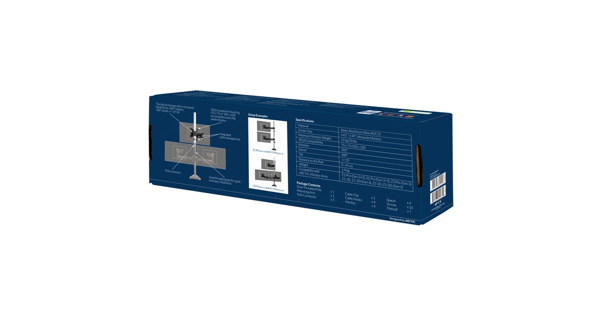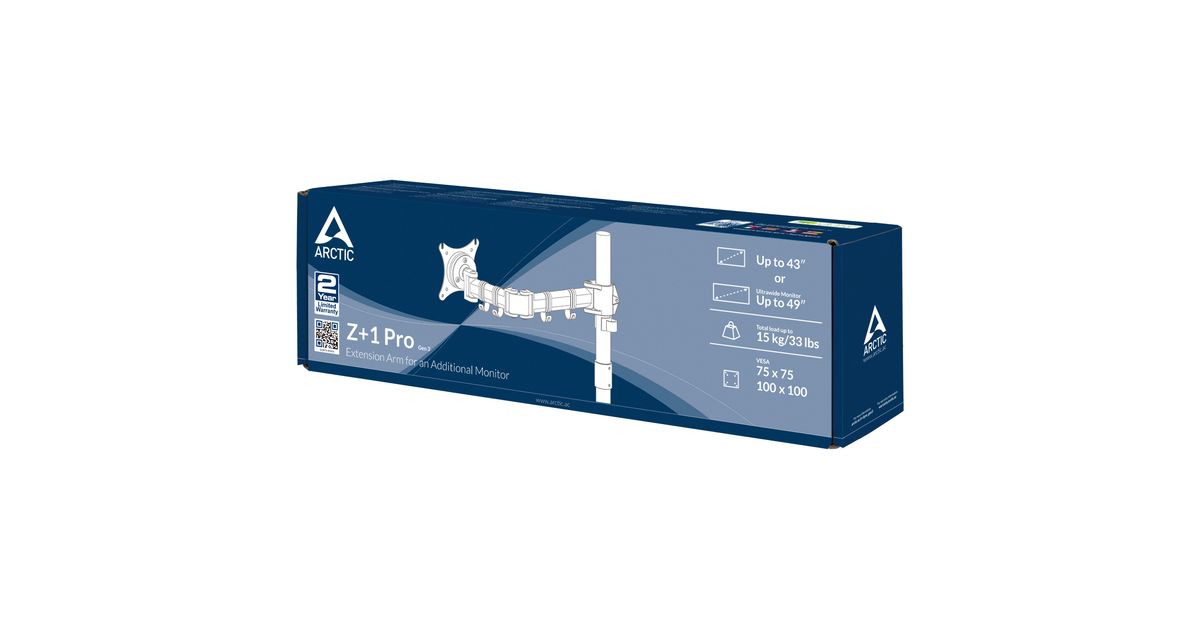 The combination of flexibility and ergonomics already make ARCTIC monitor arms a great choice for working or gaming; get even more out of your ARCTIC monitor arm with the Z+1 Pro (Gen 3). The extension arm is compatible with most monitor arms of ARCTIC‘s Pro and 3D series and is easy to install.This means you can instantly add more viewing area and flexibility to an existing setup at the turn of a hand. Thanks to VESA standards 75x75 and 100x100, the Z+1 Pro (Gen 3) is compatible with most flat panel displays and carrys up to 15 kg with ease.