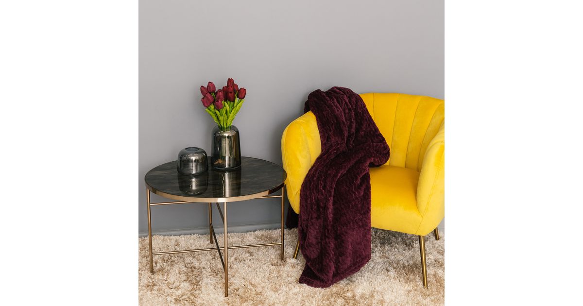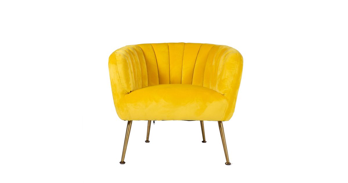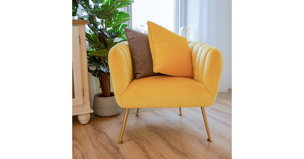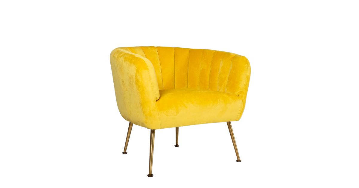 Armchair TUCKER yellow. The armchair is covered with yellow velvet fabric. The cover material is 100% polyester fabric. The armchair has golden stainless steel legs. The dimensions of the armchair are 78x71xH69cm.