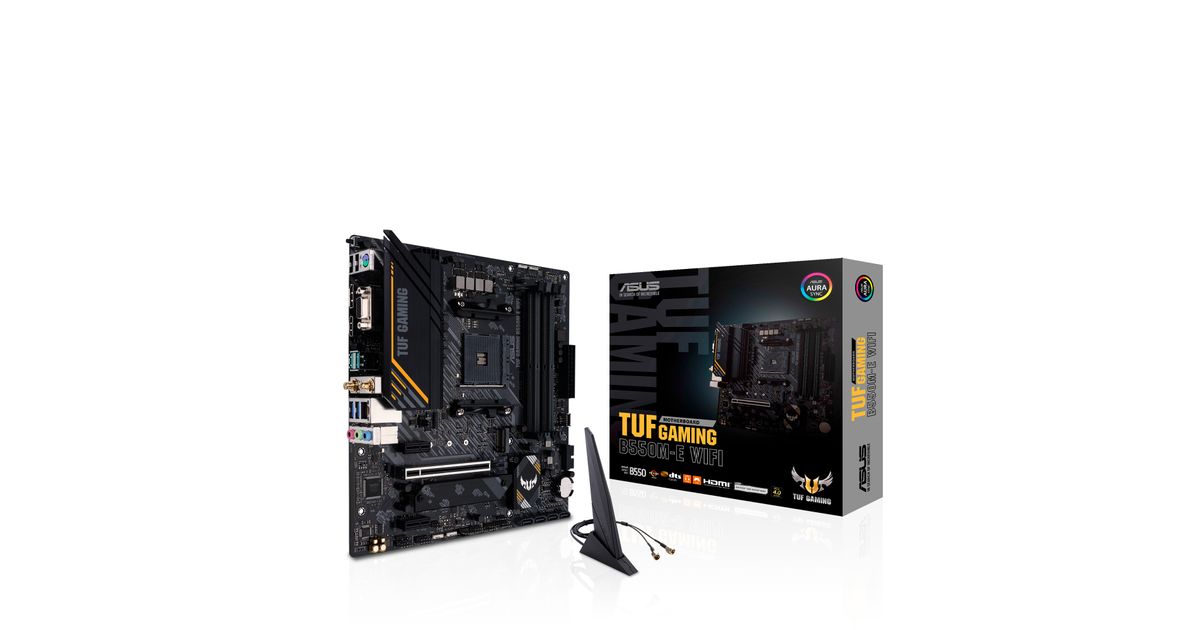TUF Gaming B550M-E WIFI provides a complete, high-performance gaming package with a long list of features to improve your experience, including ultrafast networking for smoother online gameplay, pristine audio with positional cues for FPS gaming, and onboard RGB lighting that syncs with attached accessories to help you create a personalized gaming atmosphere.