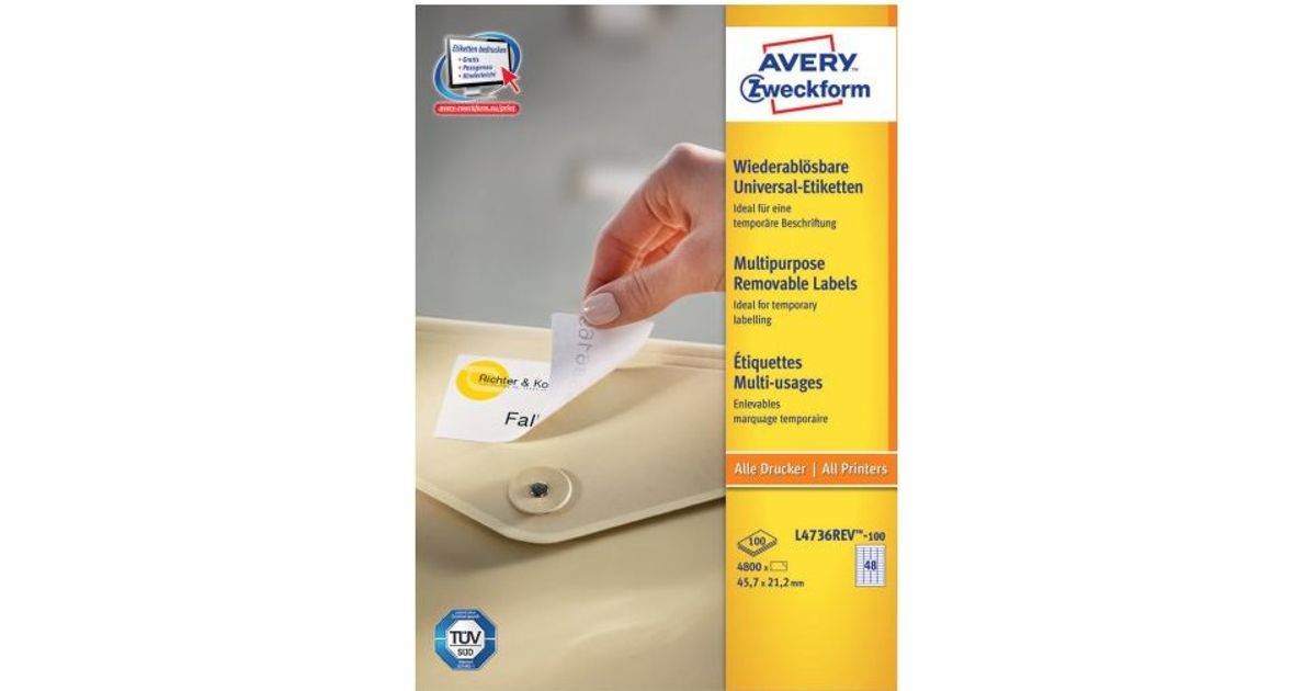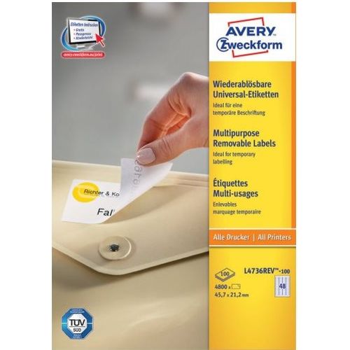 Avery L4736REV-100, White, Rounded rectangle, Removable, 45.7 x 21.2 mm, A4, Paper