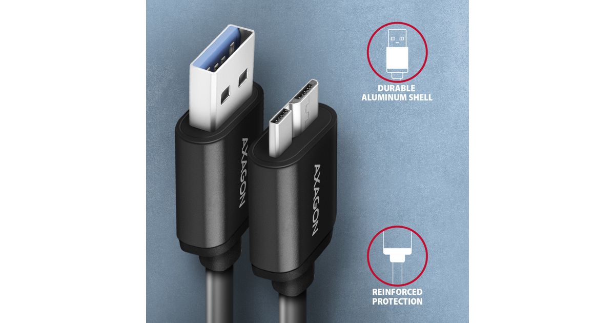 Premium connection Micro-B USB <-> USB-A Data and Charging AXAGON BUMM3-AM10AB SPEED USB 3.0 cable with Micro-B USB male and USB-A male connectors. The cable is designed for fast data transfers and external hard disks and other mobile device charging. It supports up to 5 Gb/s data transfer and charging with current up to 3A.