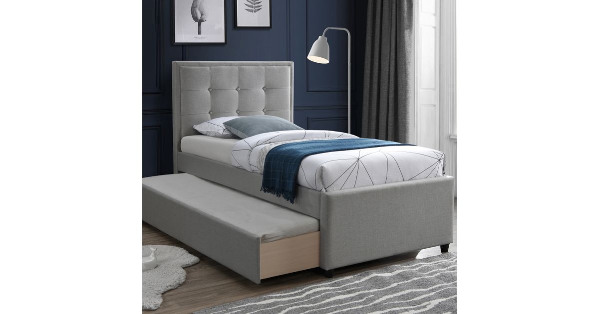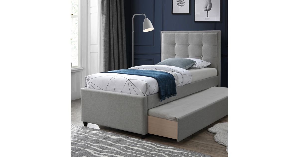 Bed OSWALDO 90x200cm, without mattress, platinum grey. The drawer under the bed can be pulled out on both sides and used as an additional sleeping space or for storage. The bed frame is made of MDF board and covered with polyester fabric. The set includes bed legs, headboard, and bed base slats. The mattresses are not included. the dimensions of the suitable mattresses are 90x200cm. The height of the additional mattress can be up to 20cm. The overall dimensions of the bed are 98x215,5xH117,5cm.