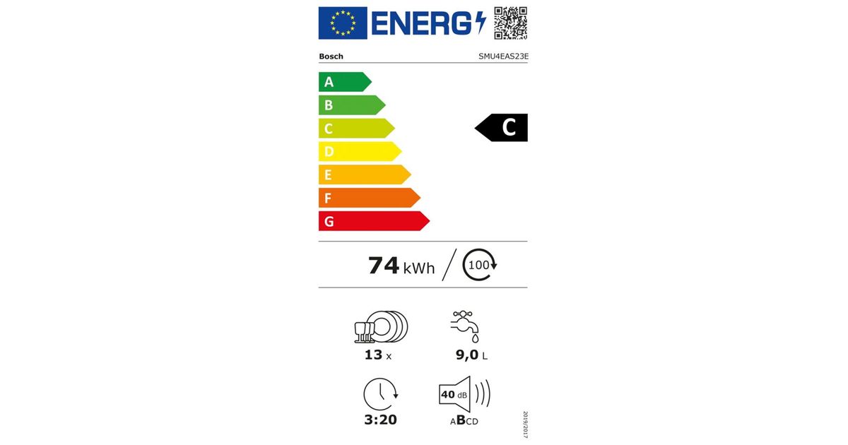 If you're looking for an energy-efficient dishwasher, the Bosch SMU4EAS23E is the perfect choice. With an energy efficiency class of C and low consumption of 74 kWh of energy and 9 liters of water per cycle, it's not only environmentally friendly but also cost-effective. With a capacity of 13 place settings and a program duration of 3 hours and 20 minutes, it's perfect for households with high demands.