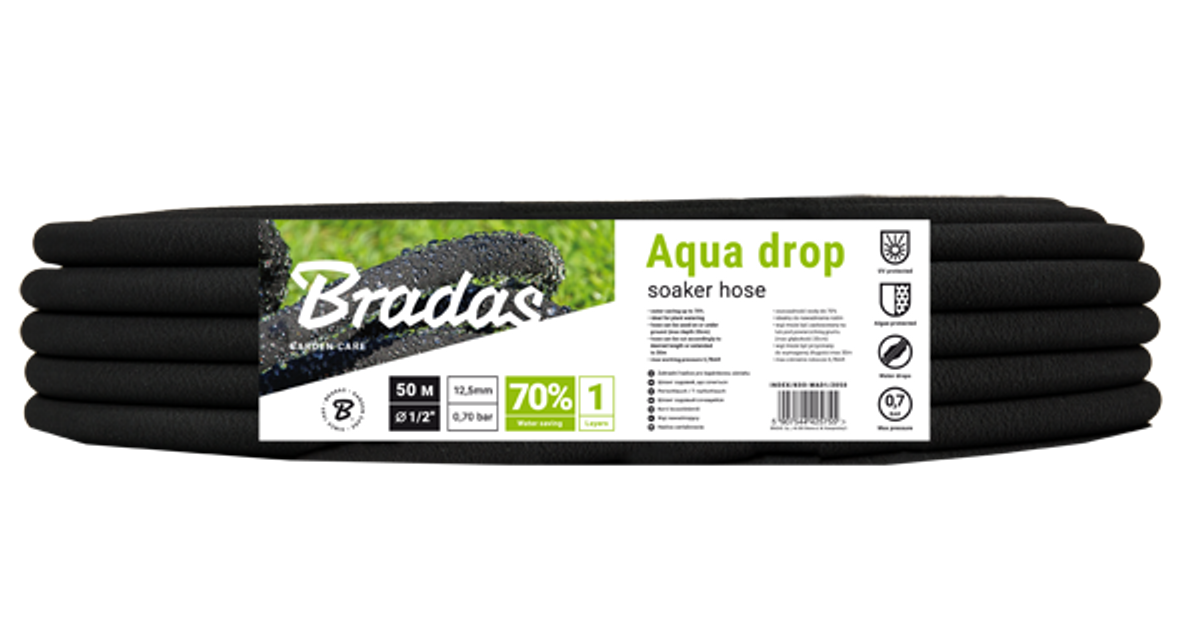 AQUA-DROP - flexible and durable, made in 100% of recycled high-quality rubber that allows water permeable over entire length. Provides water saving up to 70%. Can be covered with the bark or buried underground at depth of maximum 20cm. Ideal for precise and efficient plant watering. Water efficiency per 1m: 0,76l - 1,26l/minute at pressure 0,7BAR. Hose can be cut accordingly to desired length or extended to 30m. Warning: - do not use for drinkable water - do not use hot water for irrigation - at pressure exceeding 1BAR, pressure regulator should be used