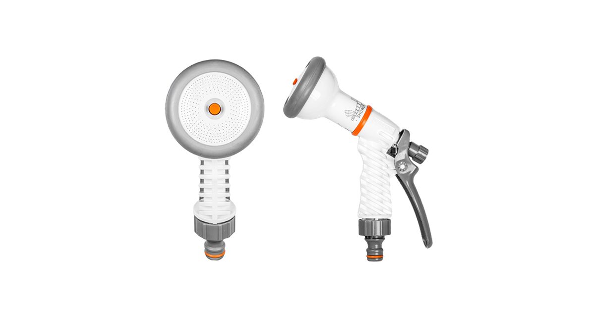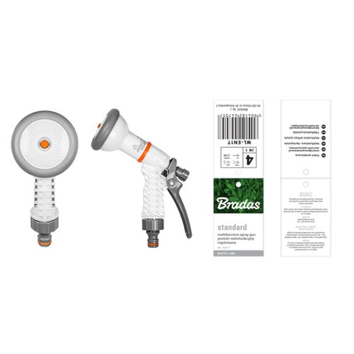 Adjustable „STANDARD» spray gun. Four easy to dial spray patterns. It is made of high impact grade plastic ABS. The quality is tested by air checking machine. 2 years guarantee . Available in grey-white color. Each WHITE LINE product has a label with description and barcode.