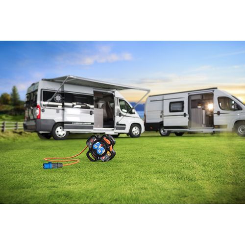 The 10m CEE cable drum, consisting of a special rubber mixture for continuous loads, is ideal for continuous outdoor use thanks to the IP44 protection class and the robust RN cable. The rubber cable drum for professional use with 3 splash-proof protective contact sockets with self-closing covers, CEE plugs and 2 CEE sockets is resistant to various oils, greases, petrol and acids, UV and ozone radiation. The camping cable drum also convinces with the following properties: