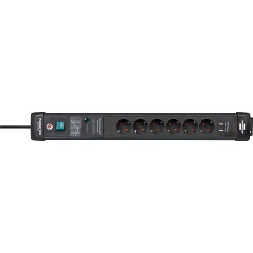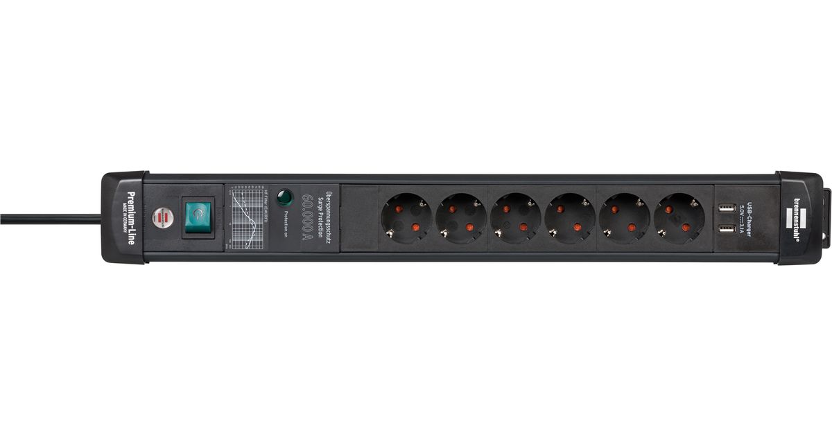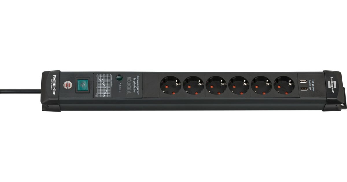 The Premium-Line 6 multiple socket strip with 2 USB charging sockets and 3m cable serves as safe protection for your connected devices against disturbances in the power grid, such as surges, indirect lightning strikes or line noise, with a maximum sum of leakage currents of up to 60.000 A. The power strip with 60.000 A surge protection not only has increased protection against accidental contact, but also impresses with the following features: