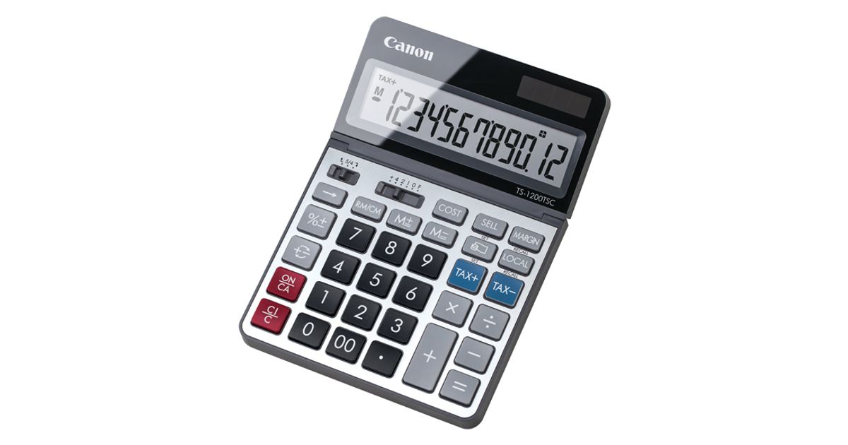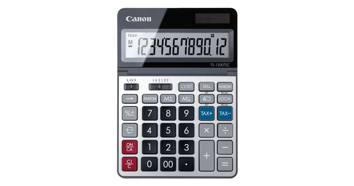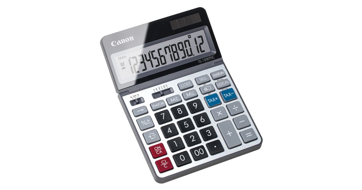 Introducing the new Canon TS-1200TSC desktop calculator. The TS-1200TSC features a 12-digit adjustable LCD display and a variety of commands, such as tax functions, currency conversion, and business calculations. Boasting a metal faceplate and a large LCD display, the TS-1200TSC is the ideal calculator for any school or home office setting.