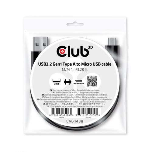 CAC-1408 - The Club 3D USB 3.2 Gen1 Type-A to Micro USB Cable enables the connection of your existing USB Type A output connections, Laptops, tablets and Ultrabooks, Power Chargers, etc. to Micro USB inputs, like camera's, Phones and our range of extension cables and adapters.