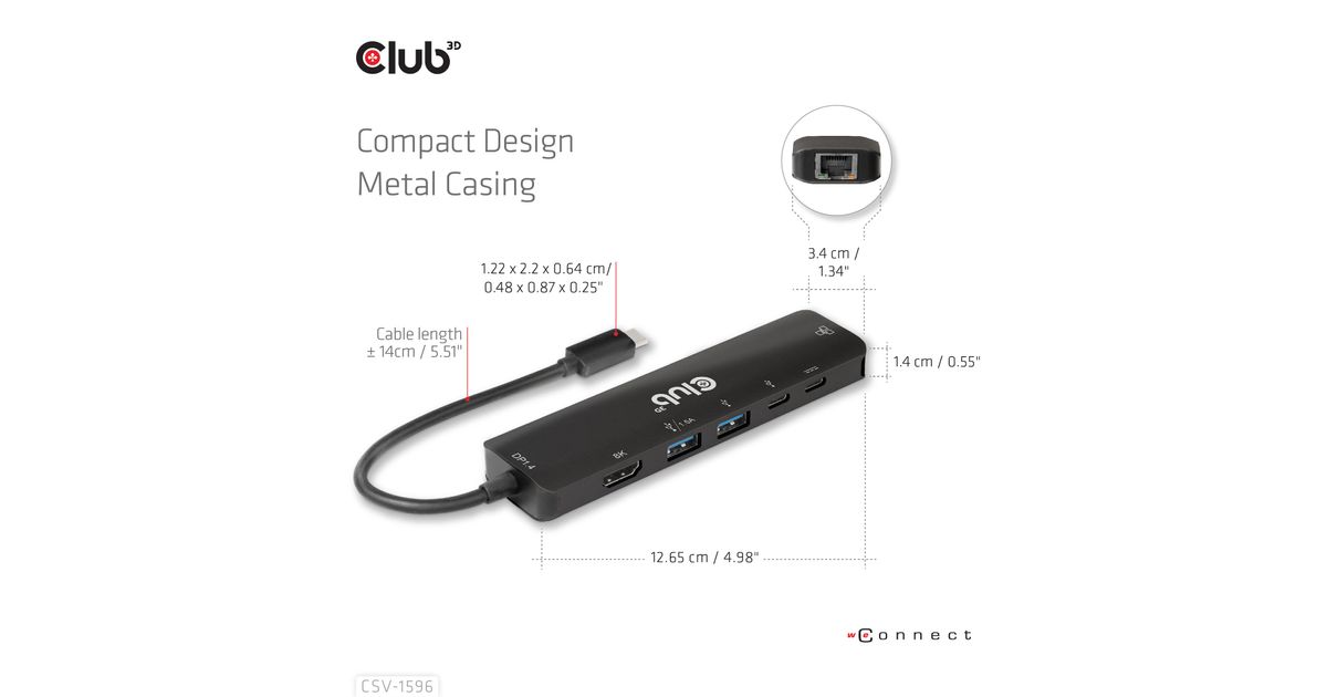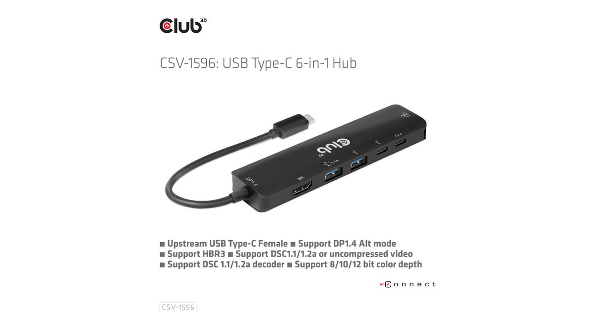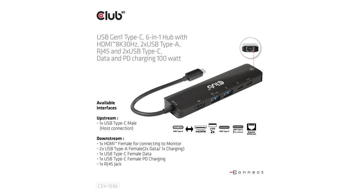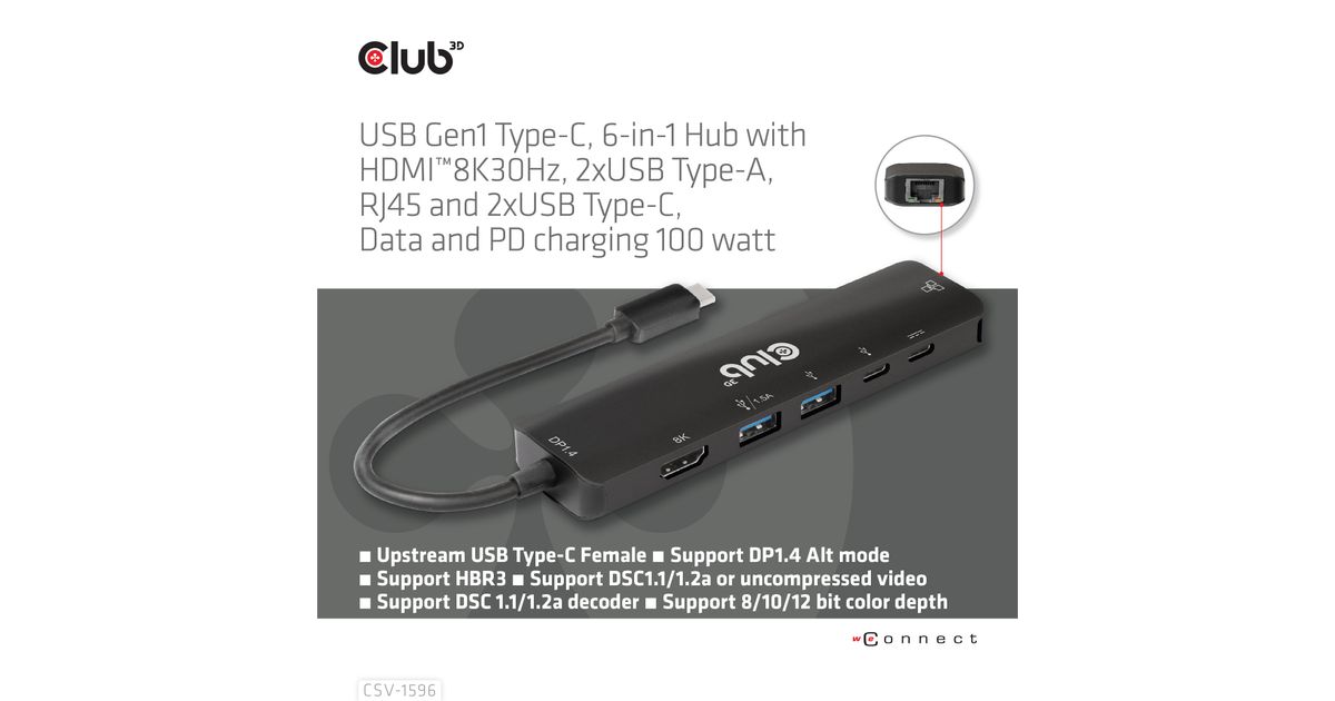 CLUB3D USB Gen1 Type-C, 6-in-1 Hub with HDMI 8K30Hz, 2xUSB Type-A, RJ45 and 2xUSB Type-C, Data and PD charging 100 watt
