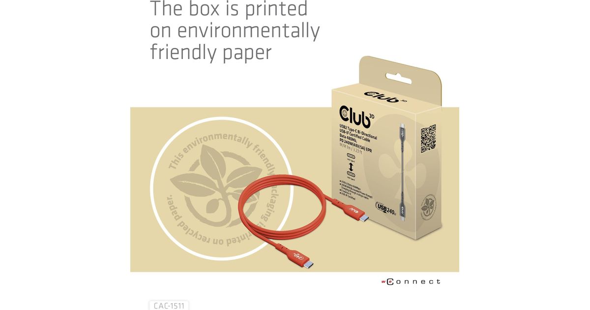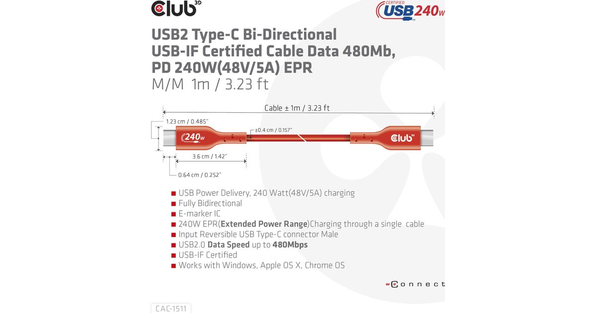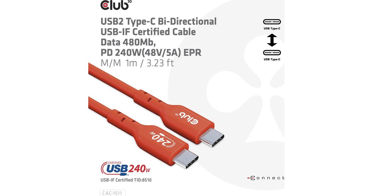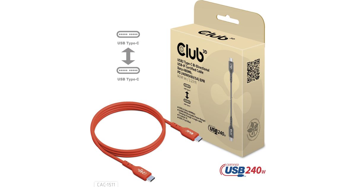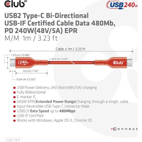 • CLUB3D USB2 Type-C Bi-Directional USB-IF Certified Cable Data 480Mb, PD 240W(48V/5A) EPR M/M 1m / 3.23 ft