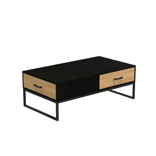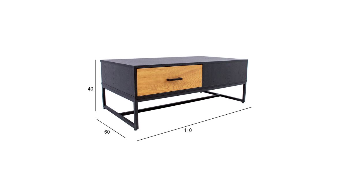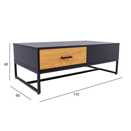 Coffee table AMSTERDAM 110x60xH40cm. Material: melamine board, color: oak/black. Black metal base frame. Soft closing drawer glides. Black aluminum handles.