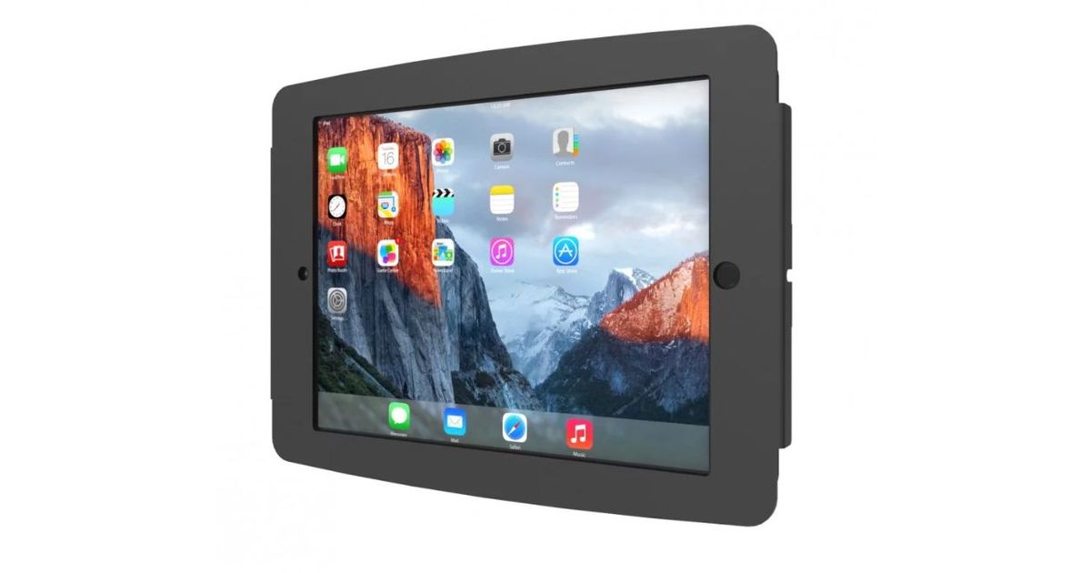 The Space iPad Enclosure features rounded edges and open corners for improved ventilation and allows for limited access to buttons and inputs. Included is a removable home button cover to restrict access to the main button.