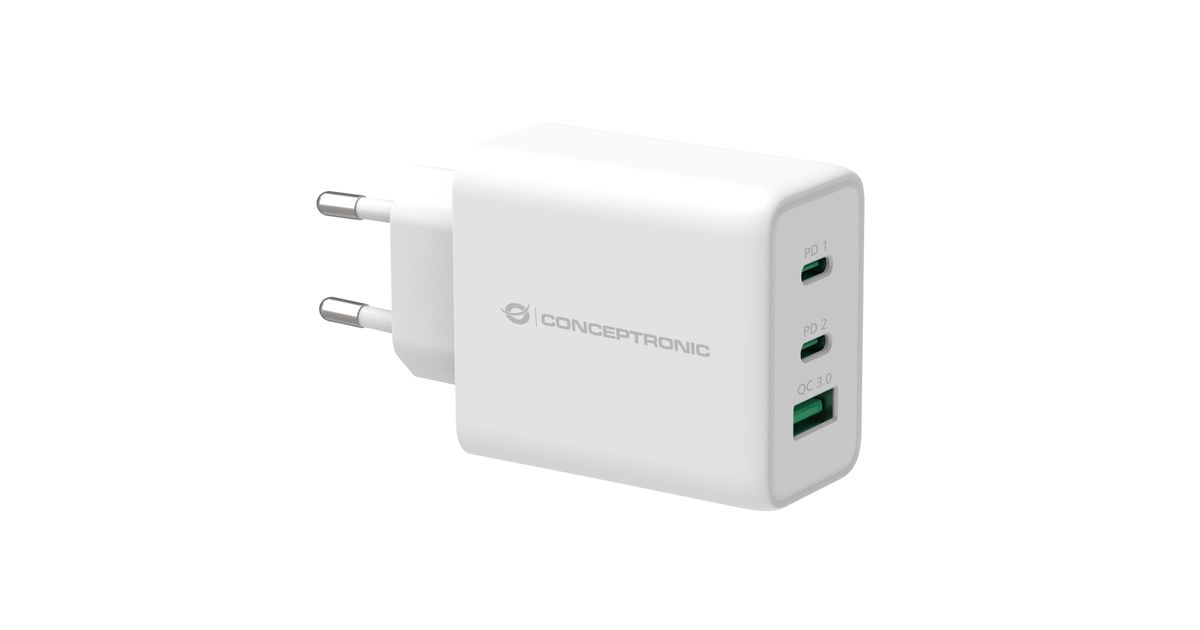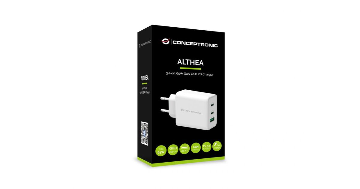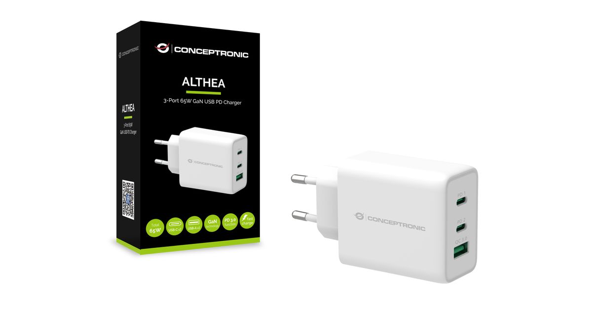 Conceptronic ALTHEA 3-Port 65W GaN USB PD Charger, QC 3.0, Indoor, AC, 5 V, White