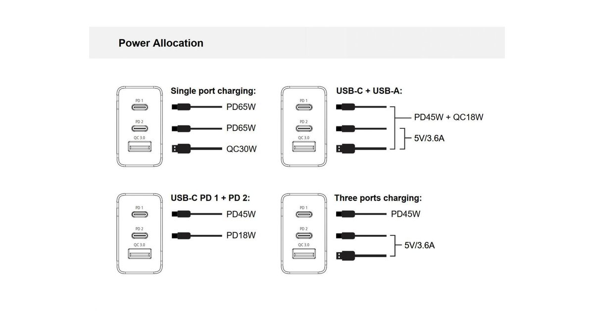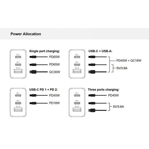 The ALTHEA12W USB charger offers efficient and fast charging, featuring 2 USB Type-C ports with Power Delivery (PD) 3.0 technology. Automatically detects and charges devices such as MacBook, Nintendo Switch, iPad, iPhone, Samsung etc., at up to 65W speed.