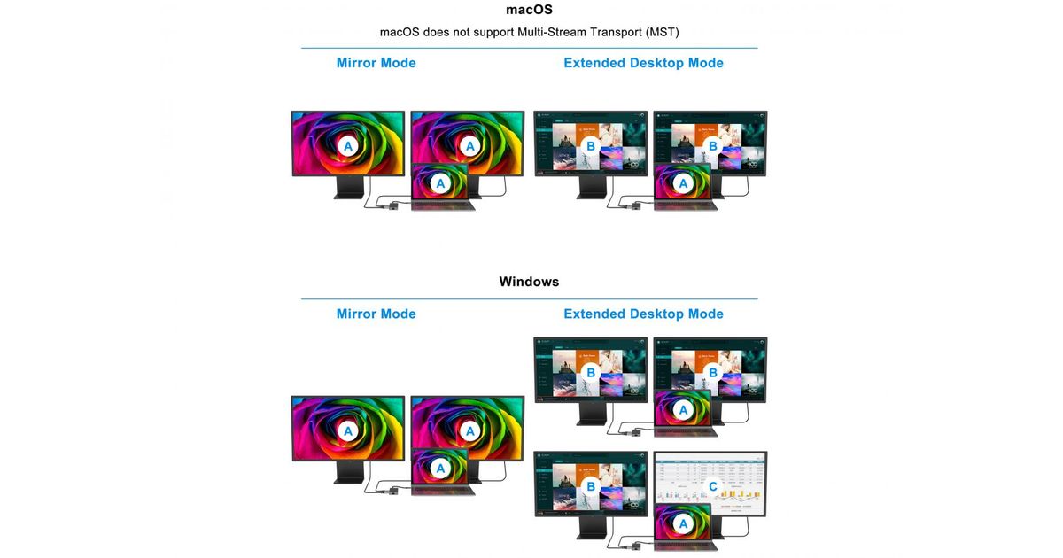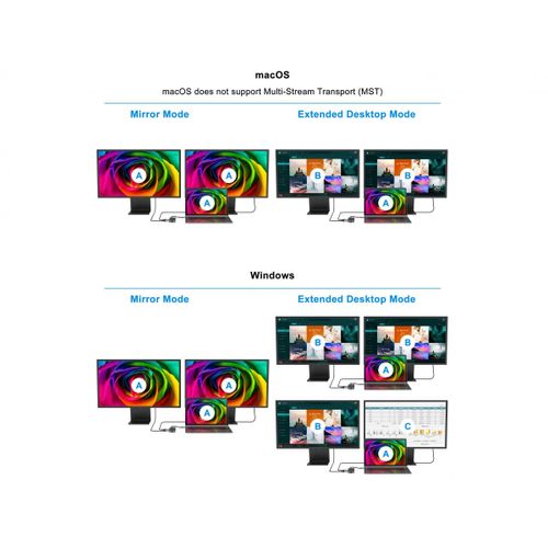 Multi Stream Transport, or MST, is a means of connecting one or more monitors together via a single display port. This technology makes it possible to connect say, two monitors to a laptop, using a docking station. This works by combining multiple video signals into one single stream and then ‘unpacking;’ them again on the display side. MST works on any Windows® device that supports DP Alt Mode (DisplayPort Alternate Mode), using USB-C.