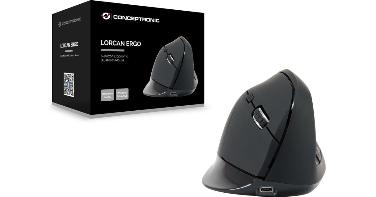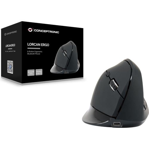 Conceptronic LORCAN ERGO 6-Button Ergonomic Bluetooth Mouse, Right-hand, Vertical design, Optical, Bluetooth, 1600 DPI, Black