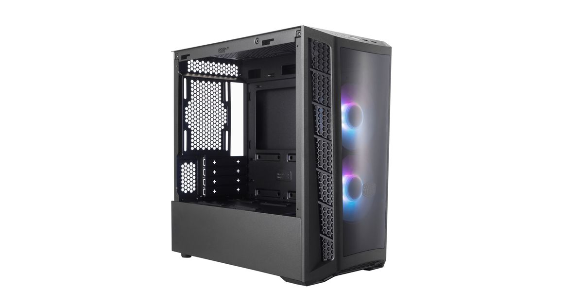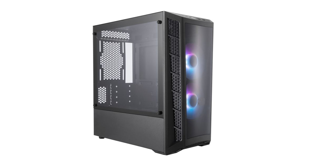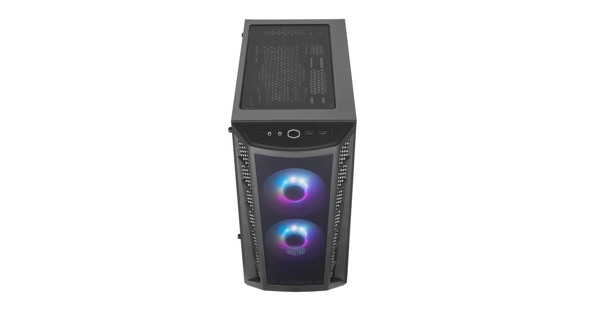 The MasterBox MB320L ARGB is a Micro-ATX PC case with two pre-installed ARGB fans and honeycomb mesh ventilation on either side of the DarkMirror front panel. The DarkMirror front panel is smoked a shade darker to sharpen the contrast of the ARGB fans pre-installed behind it, highlighting its best features.