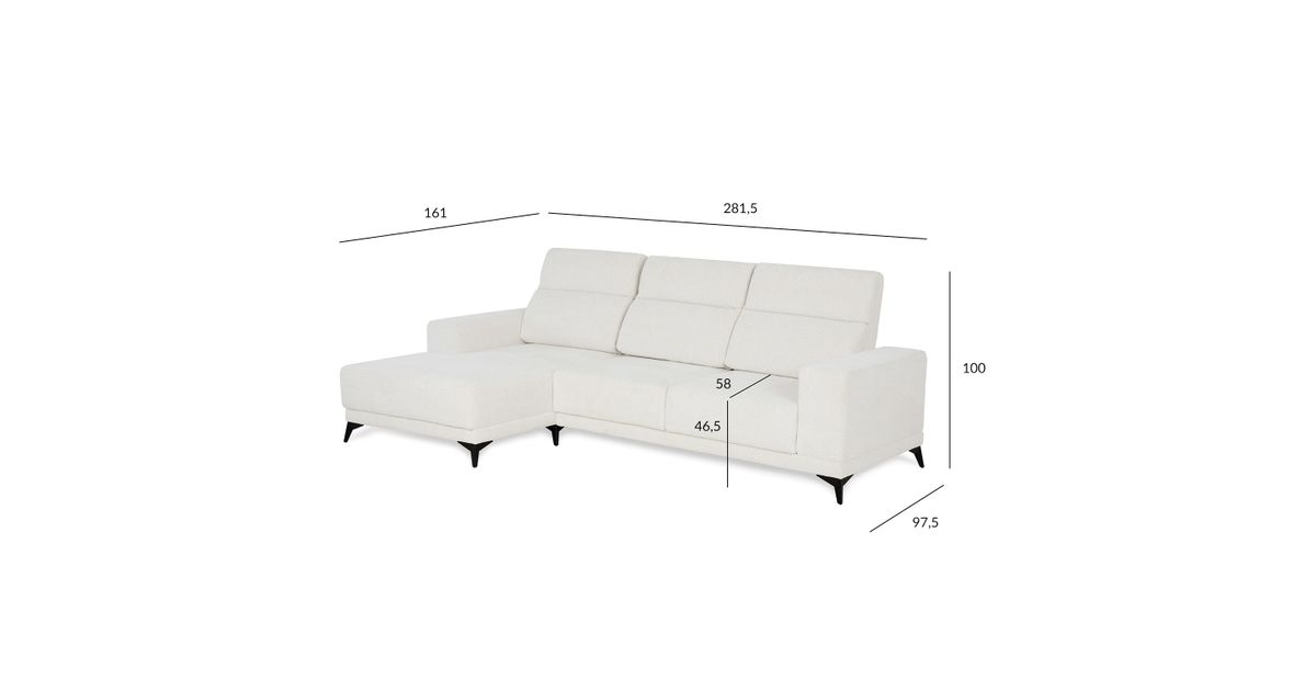 Corner sofa DARLA. The sofa is covered with durable polyester fabric, 400g/m², Oeko-Tex standard. Coating resistance: 50000 Martindale. The sofa has zig zag suspension. The construction is made of wood, plywood, particleboard, hardboard, OSB. The legs are made of metal. Product dimensions are 281,5x161/97,5xH104cm. CARE: to remove dust use a vacuum cleaner. Any stain, spills or soiling should be cleaned up promptly with a neutral soap solution rubbing a cloth in smooth circular movements.