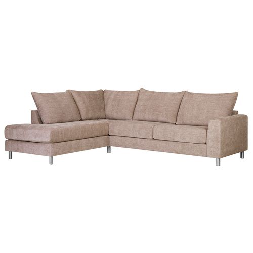 Corner sofa LEILA LC. The protruding part is on the left side of the sofa. There are four loose and non-reversible seat cushions. The cushions are made of 145mm 30kg/m3 and 40mm 20kg/m3 foam. The cushions are covered with 300g/m2 polyester fabric. The covers are removable. There are four backrest cushions which are loose and reversible. The cushions are filled with polyester fiber and foam. The filling is in a separate cover. The backrest cushions are covered with 130g/m2 polyester fabric. The covers are removable. The frame is made of solid wood, plywood, hardboard and chipboard. The frame is covered with 6mm 20kg/m3 foam. The top of the armrests are covered with 20mm 35kg/m3 foam and with 300g/m2 polyester fabric. The product has zigzag suspension which is covered with textile. The sofa has seven legs made of metal. The dimensions of the legs are D50xH120mm. The dimensions of the product are 269x92/210xH89cm. The product is made in EU.