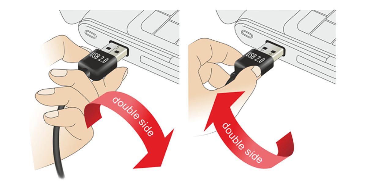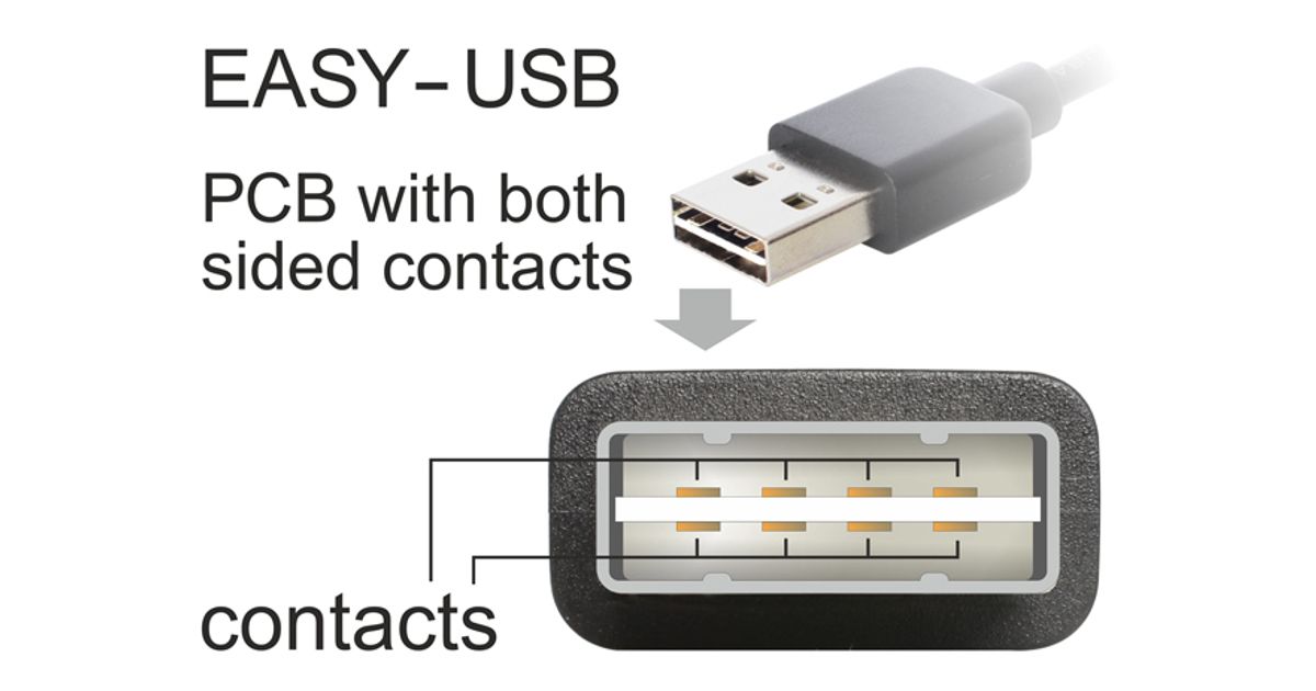This cable by Delock with EASY-USB male can be plugged into the USB-A female port in both directions. Thus the male port can be used both-sided and make the plug in easily.