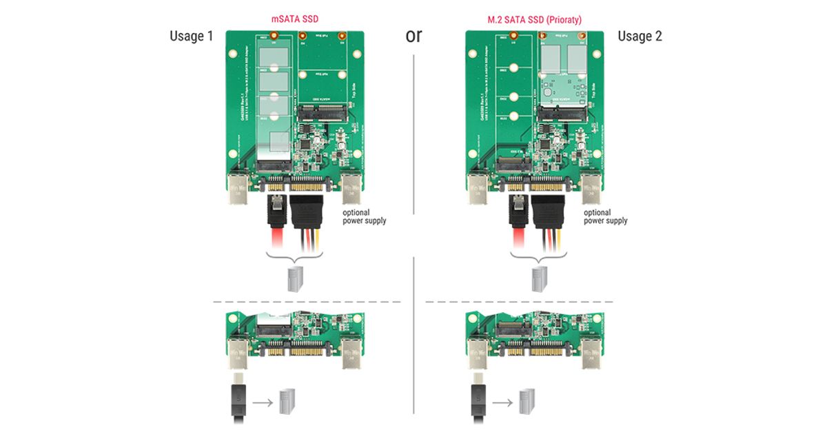 This Delock converter enables the connection of a M.2 SSD in 2280, 2260, 2242 and 2230 format or a mSATA SSD in half size or full size format. If both slots are occupied, only the M.2 SSD can be used. The converter can be installed into the system through a SATA or USB interface.