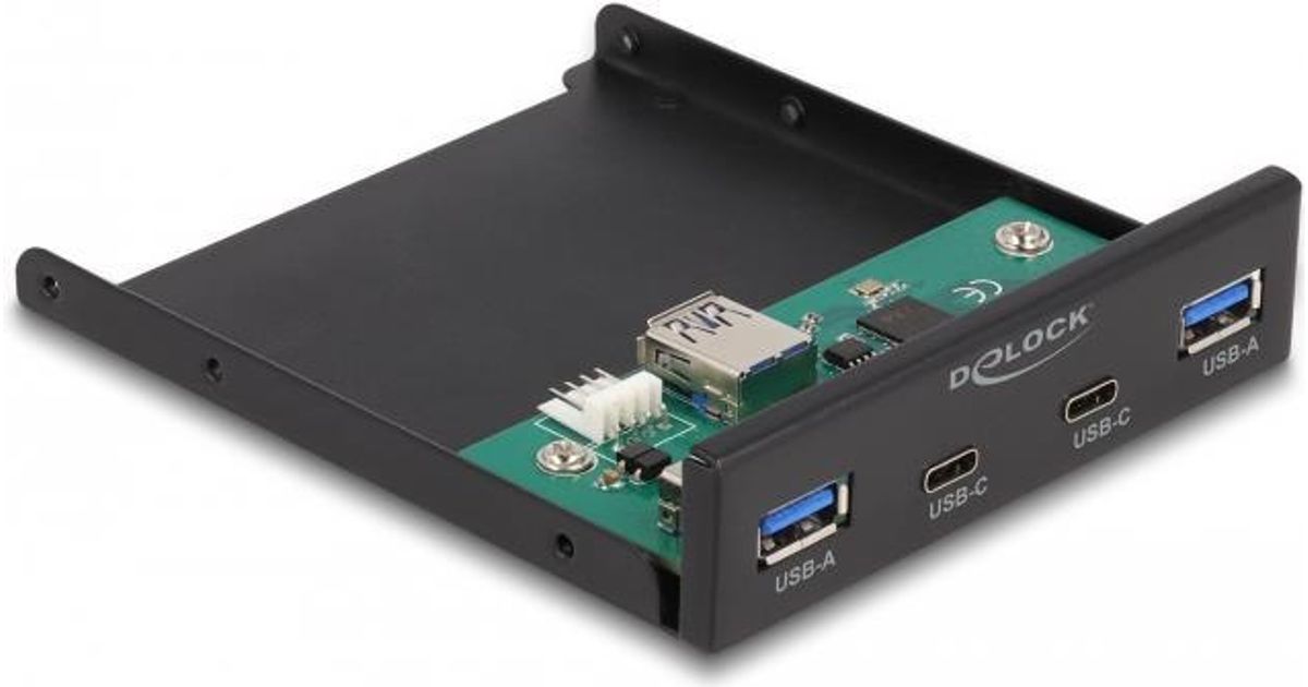 This hub by Delock can be installed into a 3.5″ bay of the PC. It will be connected internally via a USB pin header male on the motherboard. It has two USB Type-A and two USB Type-C™ ports.