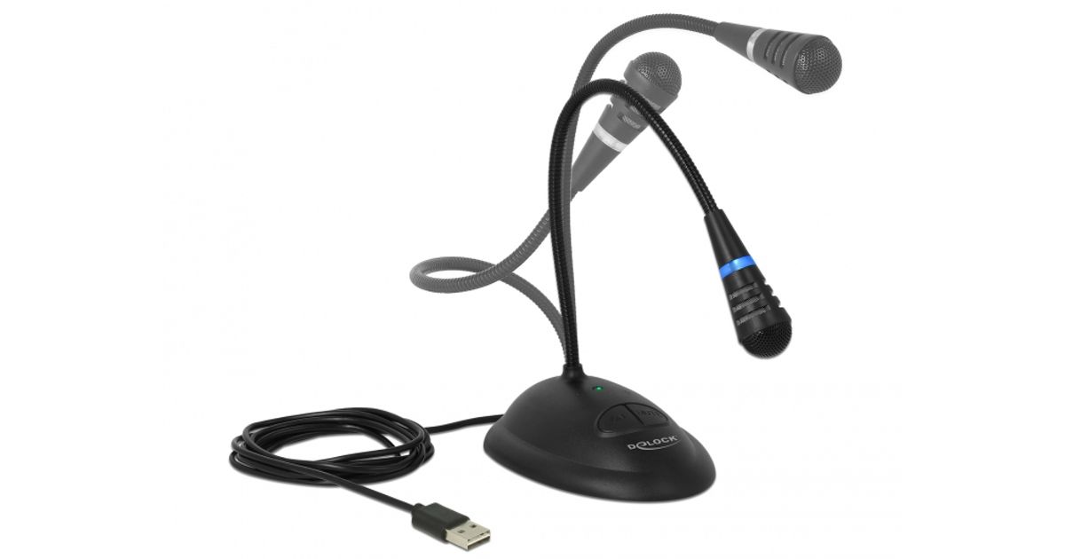 This USB microphone by Delock can be used for voice and vocal transmissions. The rubberized base provides a non-slip stand and the gooseneck allows the microphone to bend in the ideal direction. The LED ring and the green LED indicate operability and mute activation or deactivation by means of blue or red light. The Mute button mutes the microphone and the ON button switches it on and off.