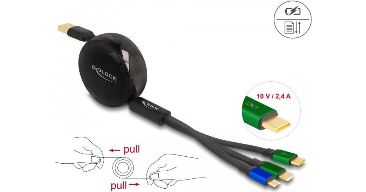 This practical 3 in 1 retractable cable by Delock can be connected to a power source with USB-A connection and can be used to charge single devices with Micro USB or USB Type-C™ interface.