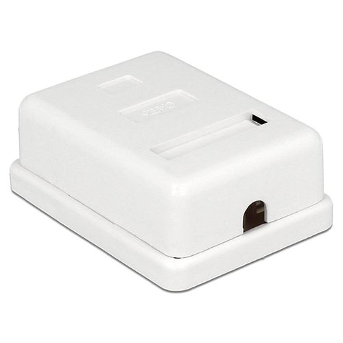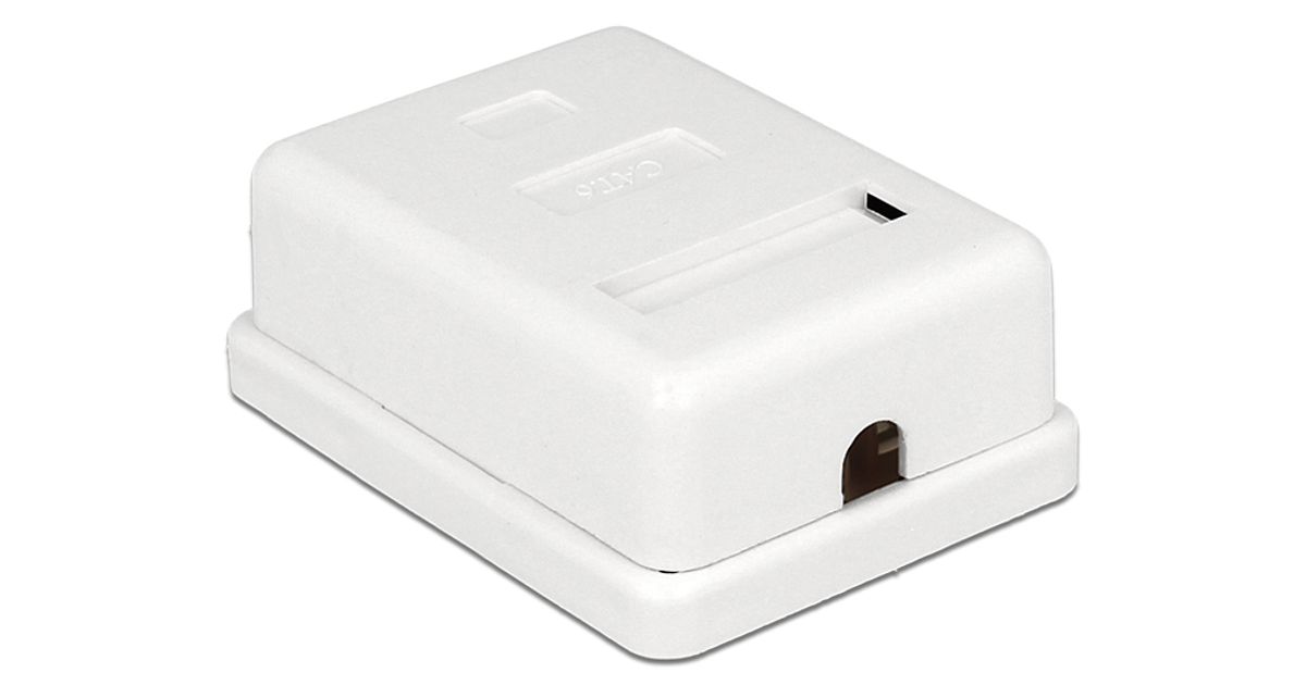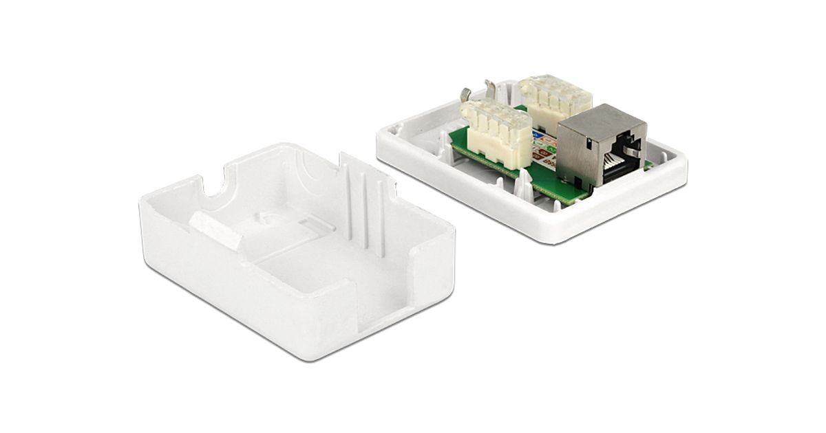 This surface mounted box by Delock can be used as a modular outlet on the wall or in enclosures. The LSA blocks can be used with a punch down tool; alternatively, a tool-free connection of the cable is possible.
