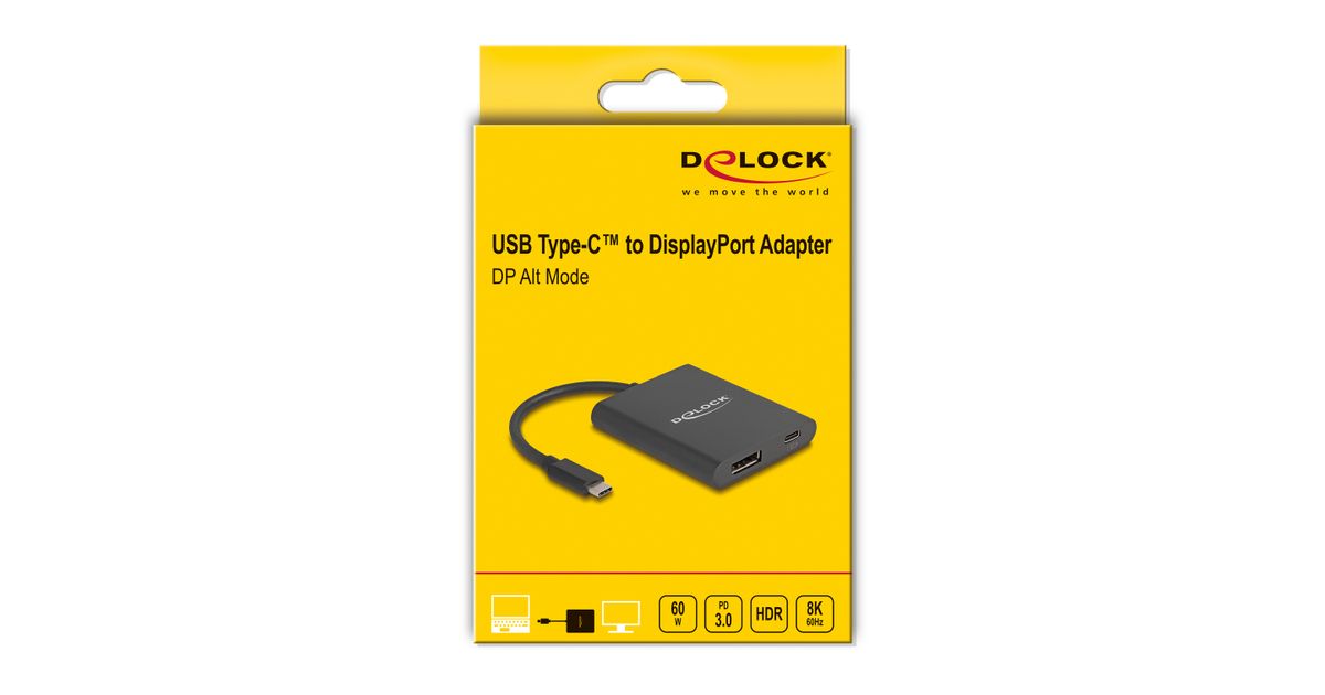 This adapter by Delock is suitable for the connection of a DisplayPort monitor in 8K Ultra HD (7680 x 4320 @ 60 Hz) resolution to a computer with USB-C™ interface and DisplayPort alternate mode support. Thus, the adapter can be connected to different laptops like MacBook, Chromebook and similar. In addition, the adapter can also be operated on a Thunderbolt™ 3 interface.