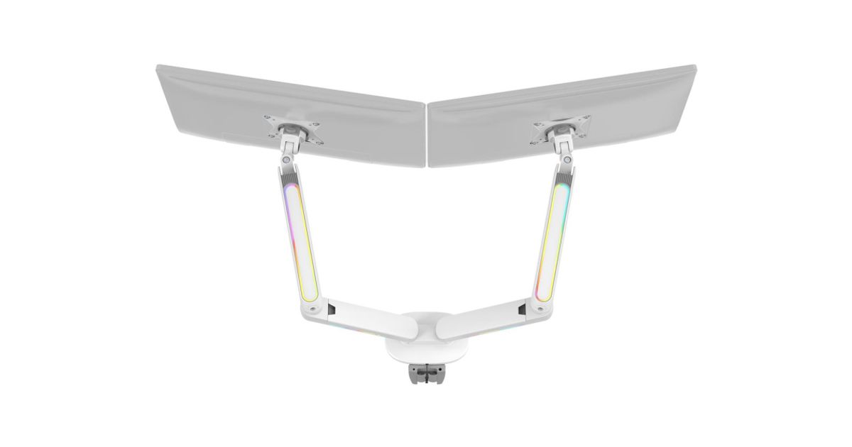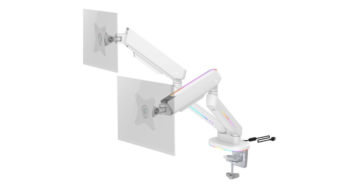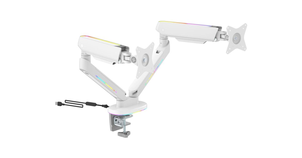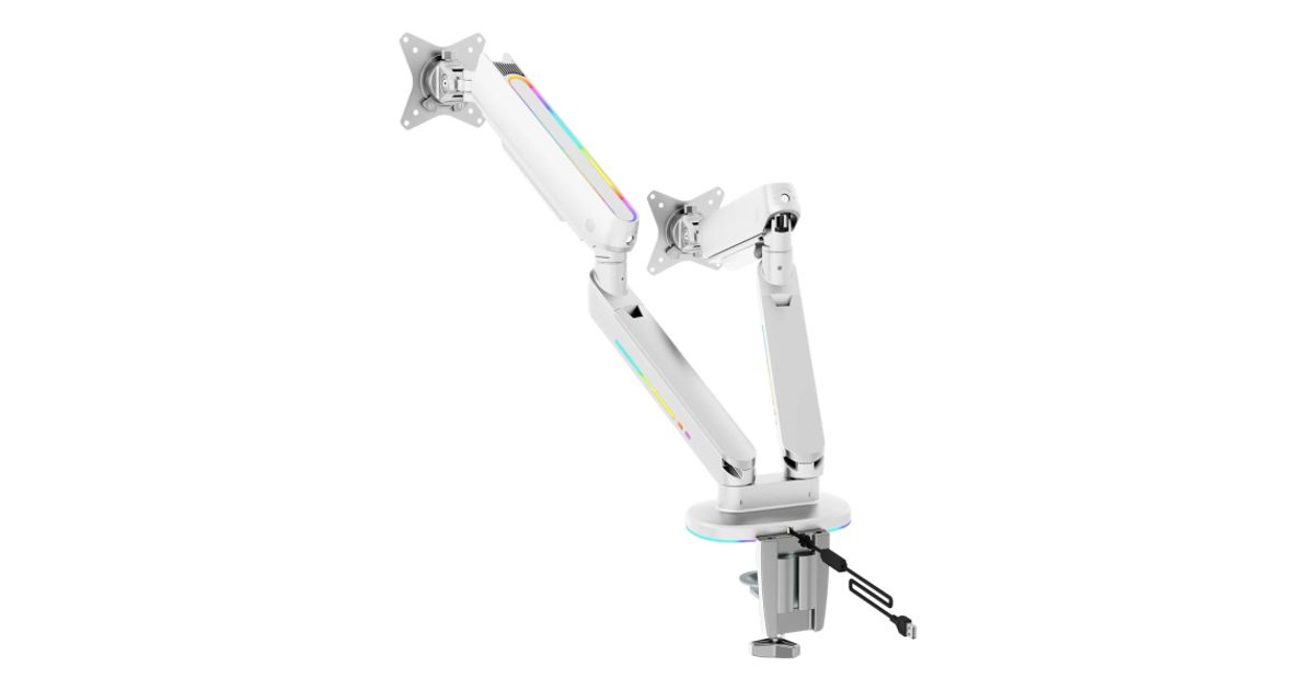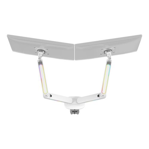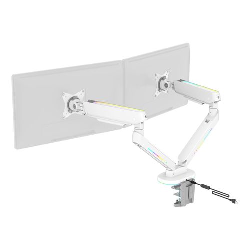 RGB gaming monitor arm to give you an enveloping light behind your monitor while you play. The built-in cable management system ensures a clean setup while keeping your monitor in place at the perfect angle. Detachable VESA plate makes it easy to install your monitor on the arm that fits monitors up to 32" with a maximum weight of up to 18kg and is designed to fit curved monitors. The RGB lighting is controlled by the included remote control and can sync with our RGB chair GAM-080 and RGB table GAM-140!