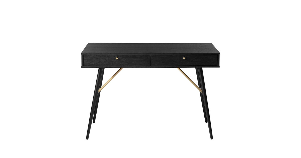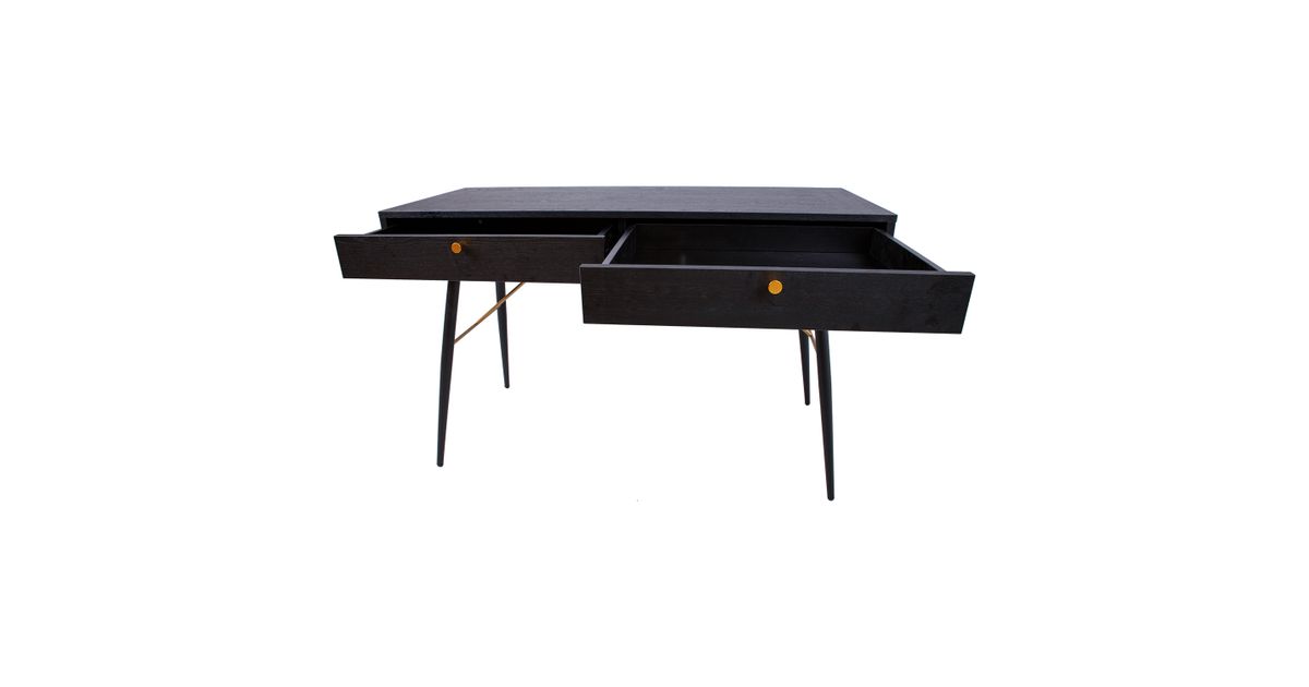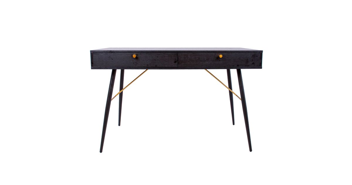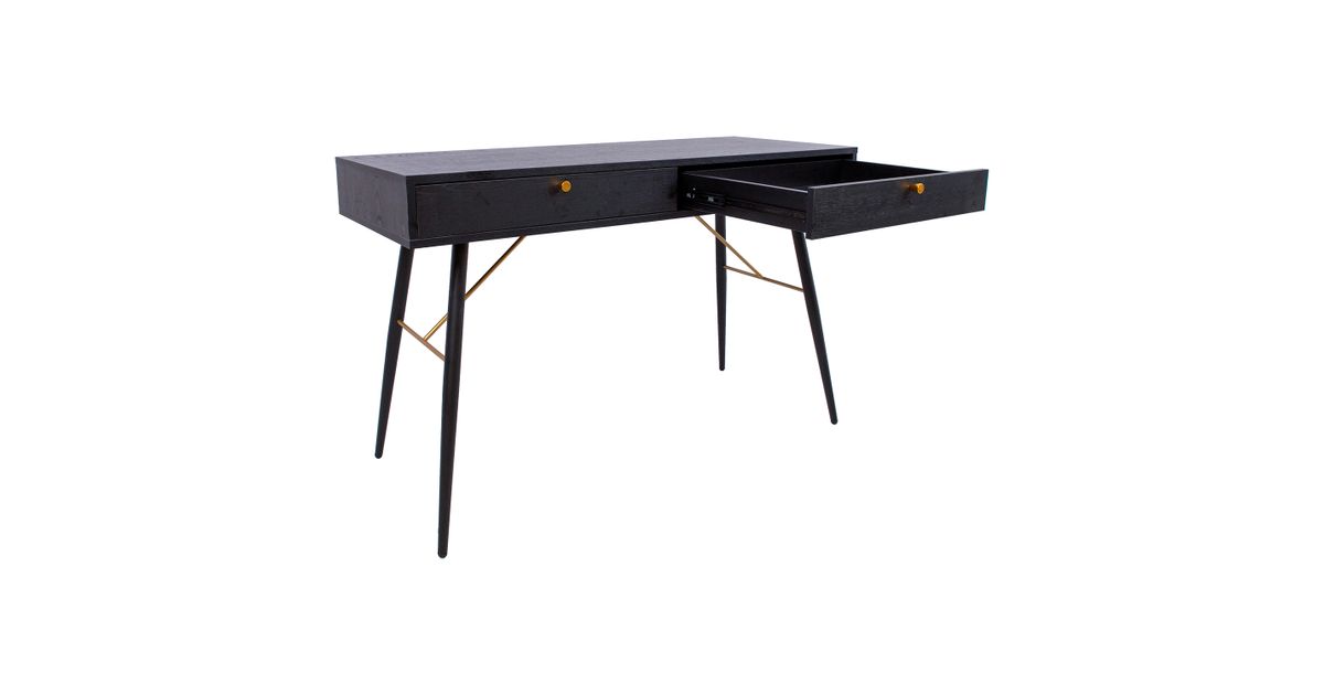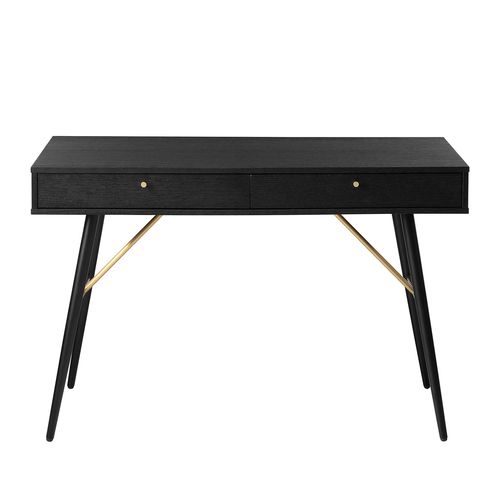 Desk LUXEMBOURG 120x48xH75cm, black melamine. The desk is made of wood looking melamine-coated furniture board. The table legs are connected by copper-colored metal details, which give the table a stylish look and at the same time ensure the strength of the base structure. There are two drawers under the table top. Drawer rails close quietly. The drawers have copper colored aluminum knobs. The height of the table legs is 62cm.