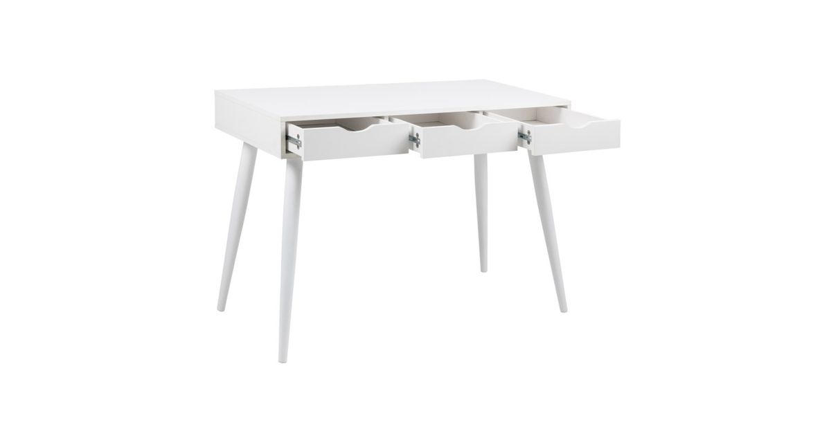 Desk NEPTUN 110x50xH77cm, white. A desk is a necessary addition to any home, allowing you to use a computer more conveniently or create a practical home office space. The desk has three drawers. The desk is made of melamine. The color is white. The base is made of metal and painted white. The dimensions of the product are 110x50xH77cm.