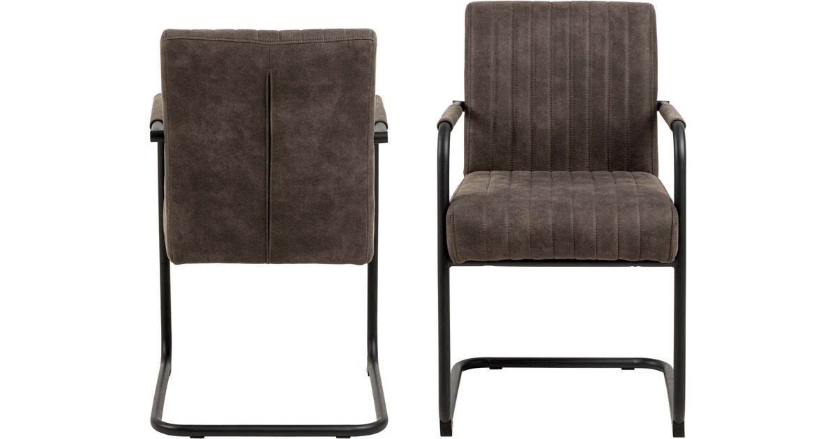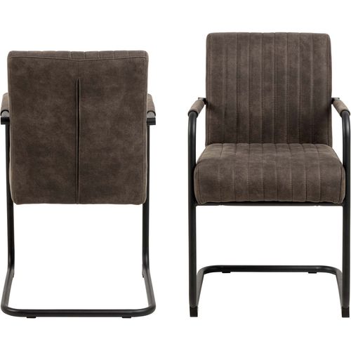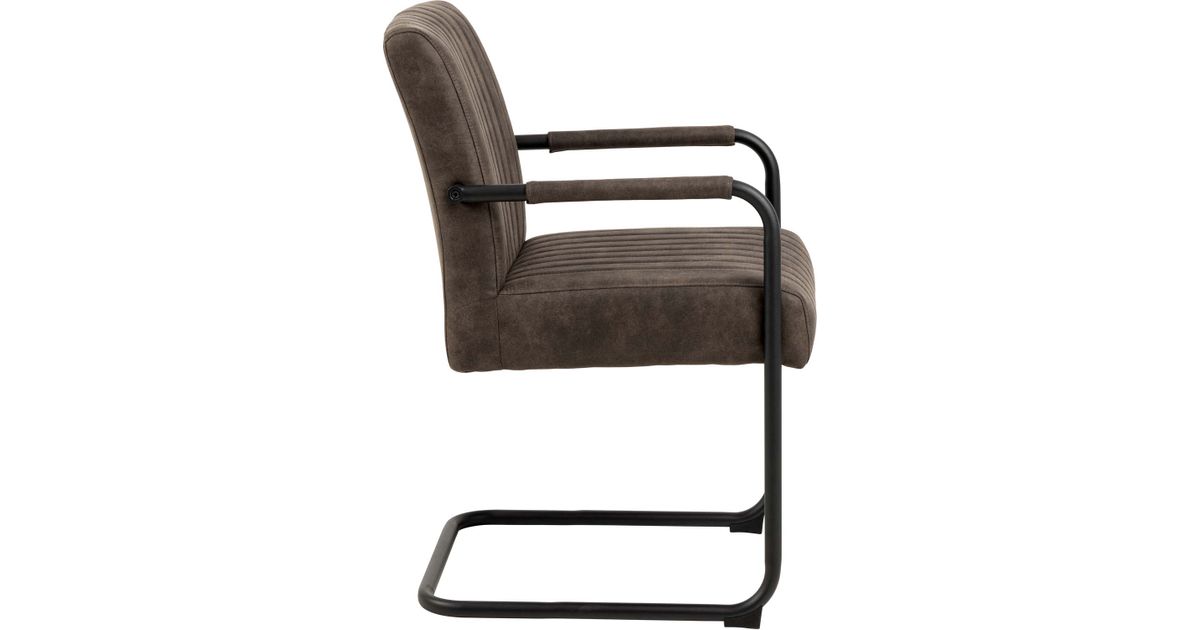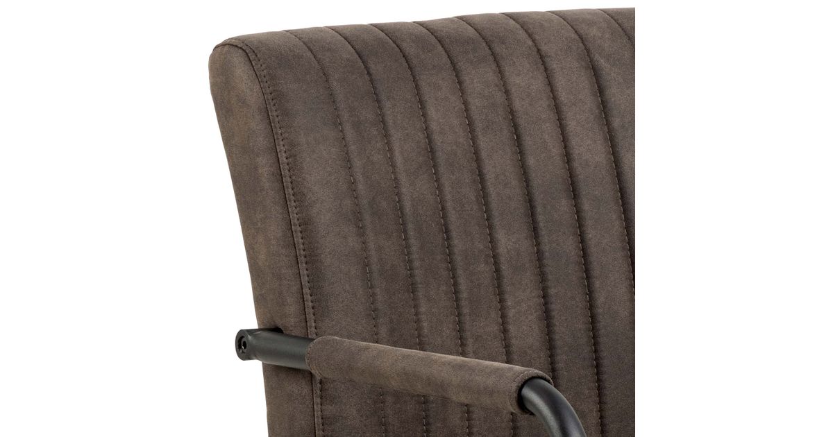 Comfortable retro-style dining chair with armrests. Upholstered chair made of polyester fabric in anthracite color. Pocket springs for snug comfort. Vertical seams for texture. The base of the leg is black with a rough powder-coated finish. Dimensions 50.5x64.5xH84.5cm.