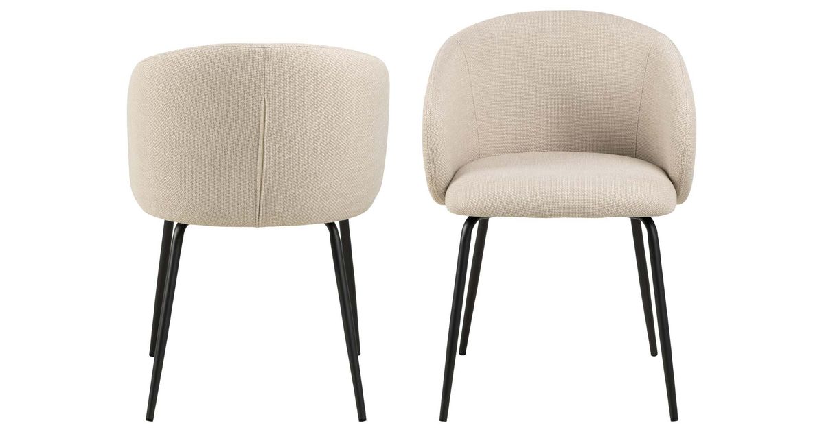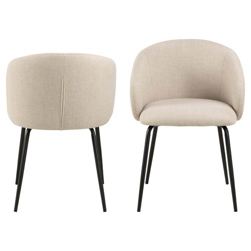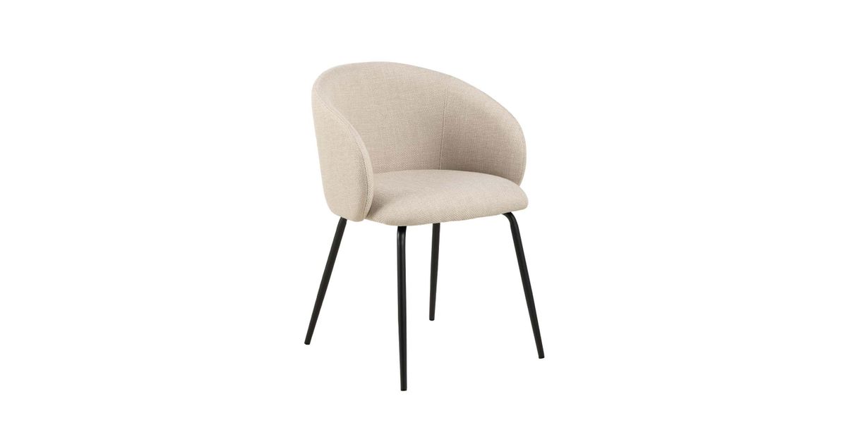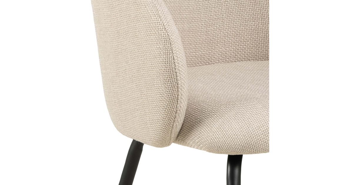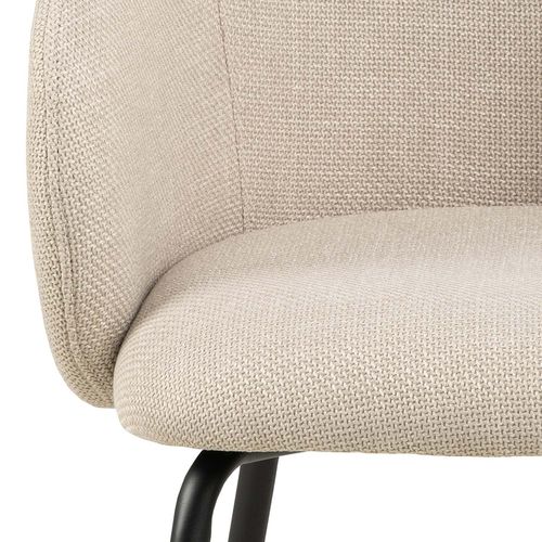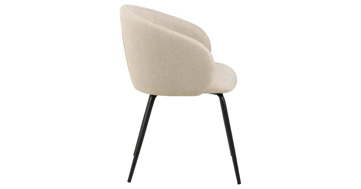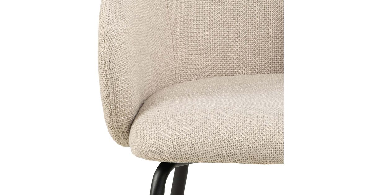 Organically shaped seat with curves creates a contemporary and feminine look. Upholstered in a beige fabric with a two-tone effect. Slim black rough powder coated metal legs as a contrasting element. The dimensions are 56x54,5xH80,5cm.