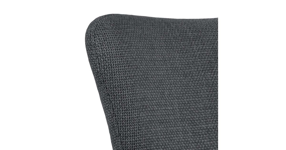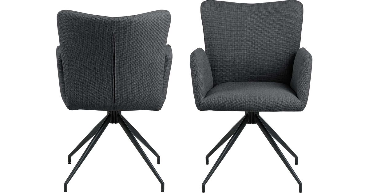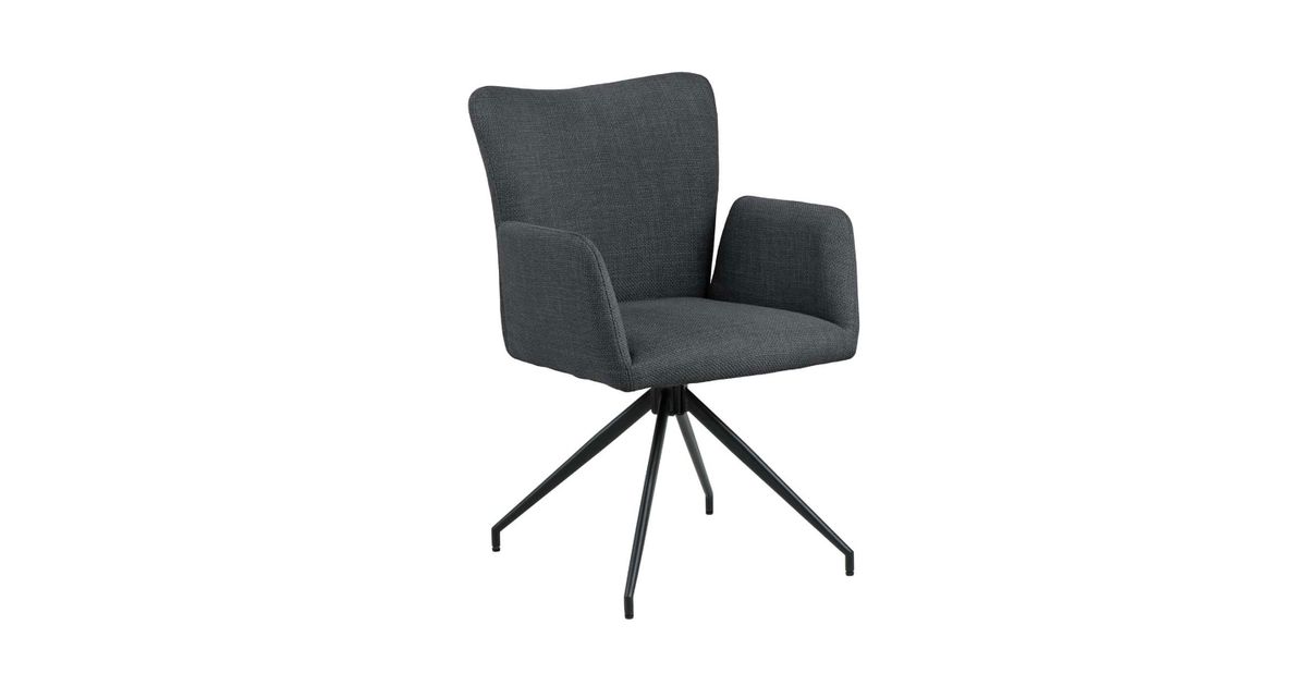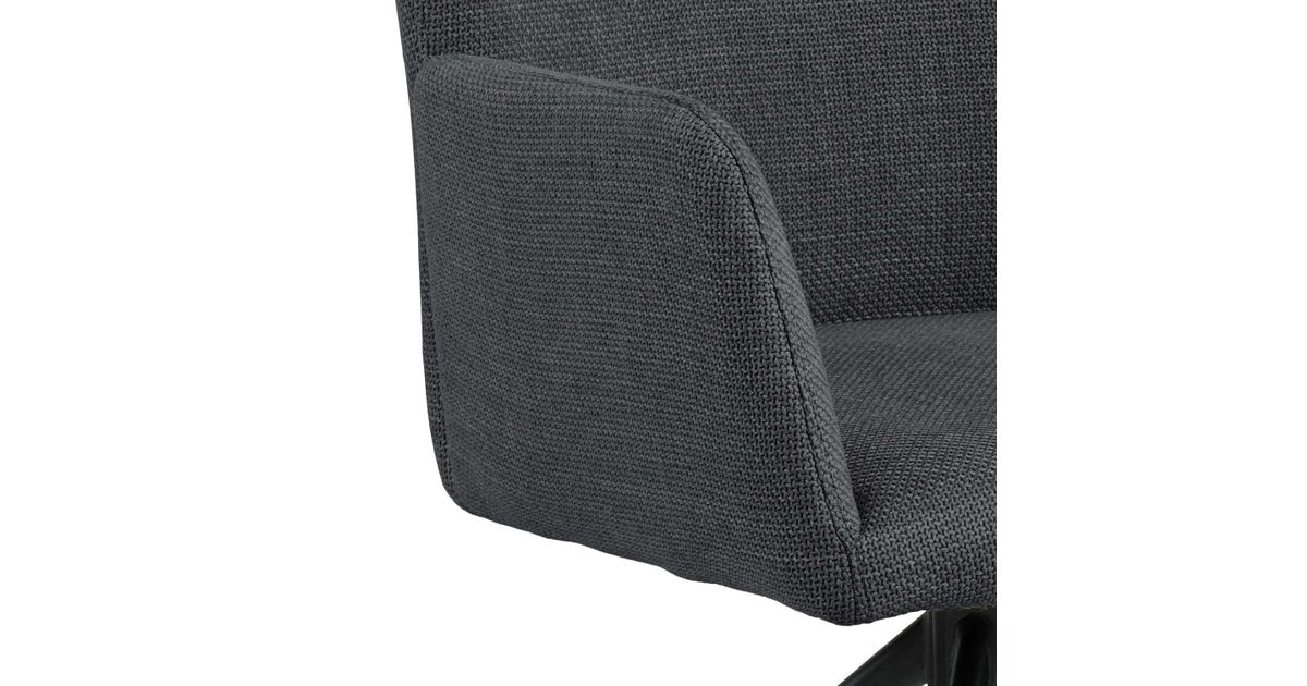 Stylish dining chair with elegant silhouette. Upholstered in a dark grey fabric with a two-tone effect. Slit between back and armrest. Black rough powder coated metal base with swivel. The dimensions are 57x61,5xH86cm.