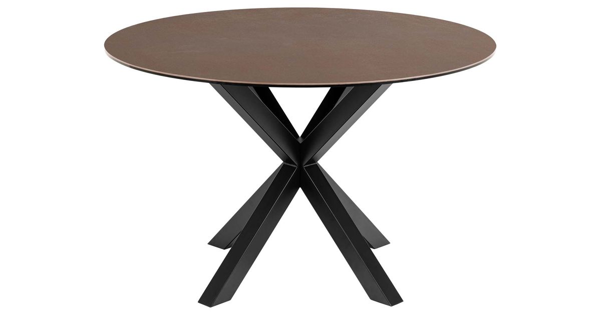 The dining table comfortably seats 4 people. The combination of the table top in a rusty brown look and the sculptural cross base in black color gives the table bold character. Made of heat- and scratch-resistant ceramic and sturdy steel, the table is ideal for everyday use or festivities. The dimensions are 119x119xH75,5cm. CARE: Ceramic is a heat- and scratch-resistant material requiring minimal maintenance. If any spots appear, simply use a firmly wrung fiber cloth or a piece of paper towel to wipe the surface clean. Use coasters to prevent any surface damage. Base: Use a cloth firmly wrung in mild soapy water for daily cleaning. To avoid rust, wipe dry. Do not scuff the surface with hard objects.