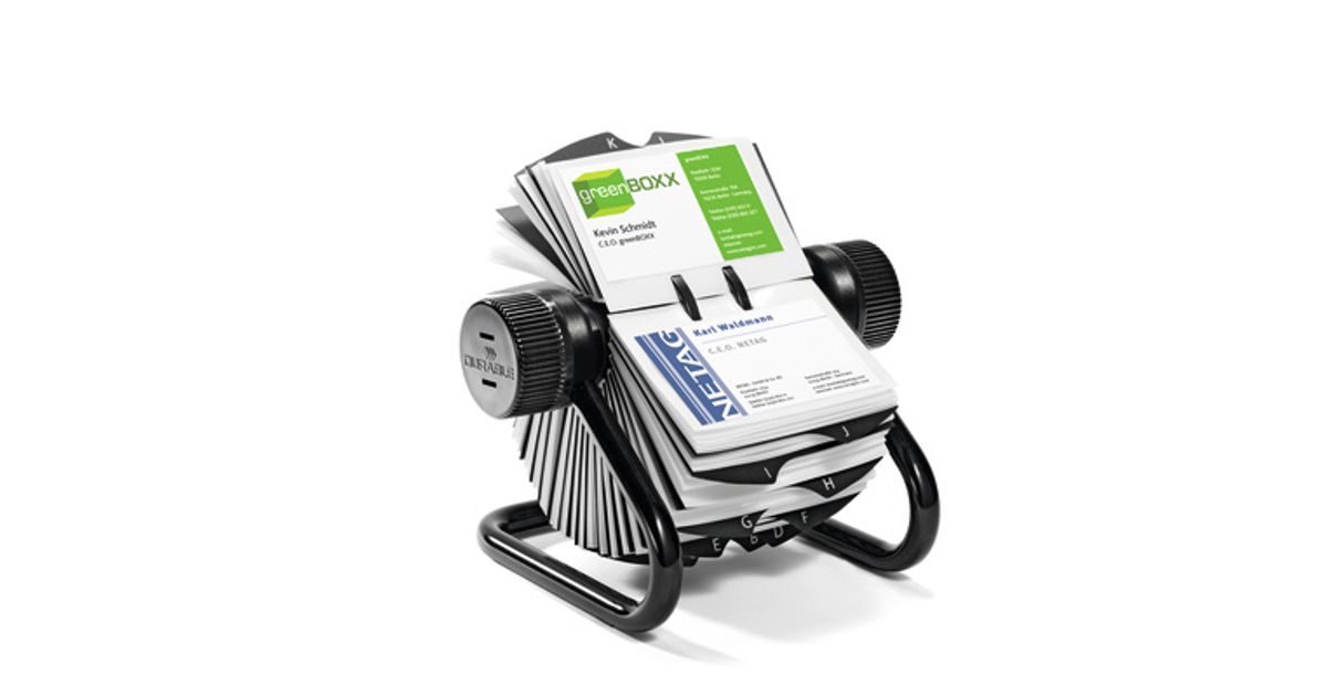 Rotary index for the storage of business cards. Supplied with 200 business card pockets (104 x 72 mm) for storage of up to 400 cards. Complete with 25 part A-Z index. Provides quick, simple access to cards thanks to special rotary mechanism. Easy removal and insertion of pockets.