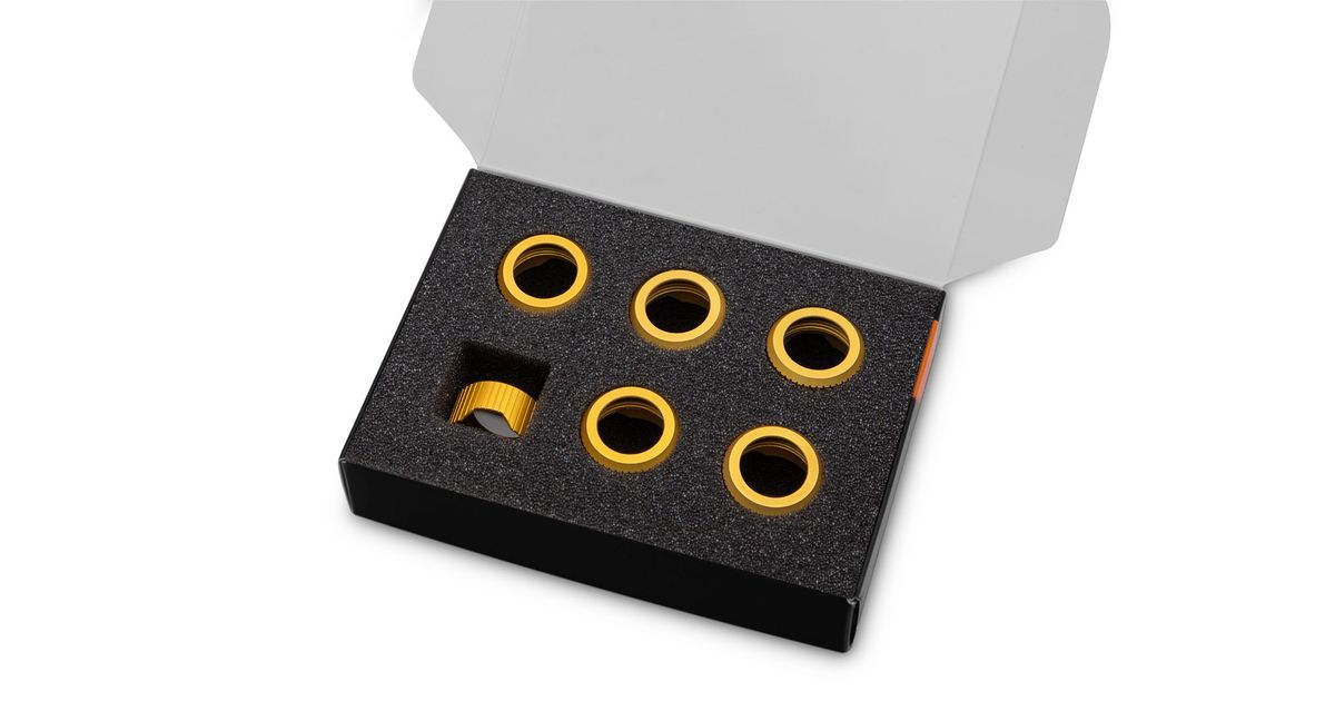 EK-Quantum Torque Compression Ring 6-Pack HDC 14 - Satin Gold is a premium locking ring made for the EK-Quantum Torque HDC 14 series fittings. It is not a stand-alone product, requiring an existing Torque fitting's barb.