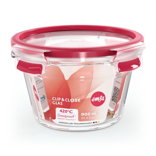 EMSA CLIP & CLOSE N1040400, Box, Round, 0.9 L, Transparent, Glass, 420 °C