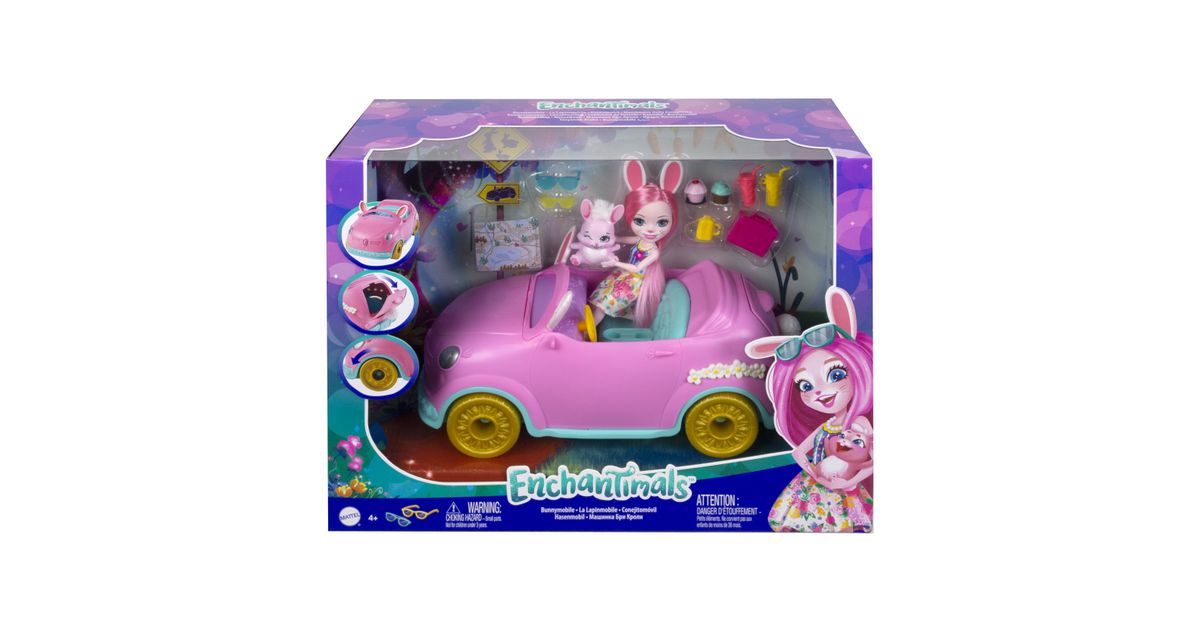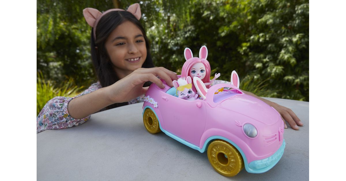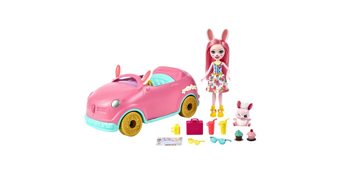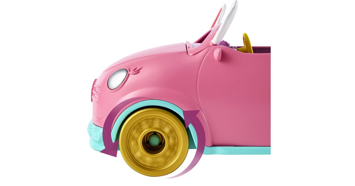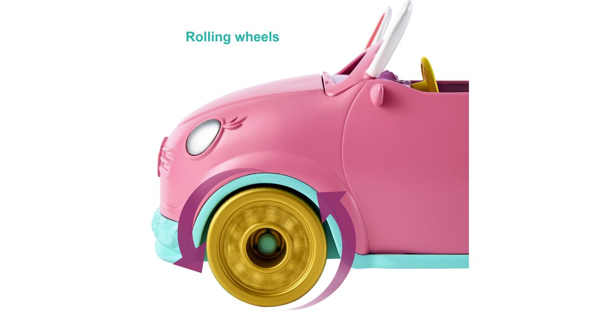 Hop in the Enchantimals™ Bunnymobile! With rolling wheels, a trunk that really opens, and cute bunny details -- this convertible is made for road trip adventures. Bree Bunny™ doll (6-inch) and Twist™ are ready to hit the road with their suitcase, sunglasses, map, drink bottles, and more! Kids will love playing out adventures with this Enchantimals™ 10-piece Bunnymobile doll set. Just push to start the fun! Colors and decorations may vary.