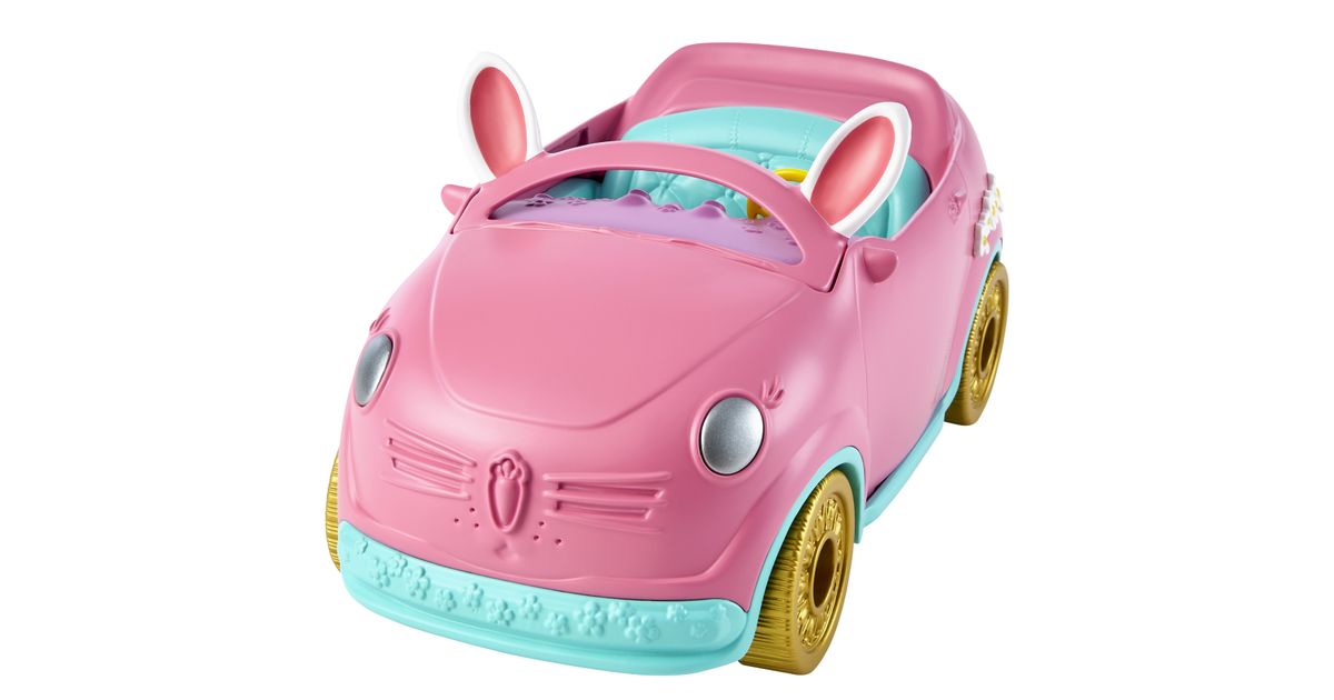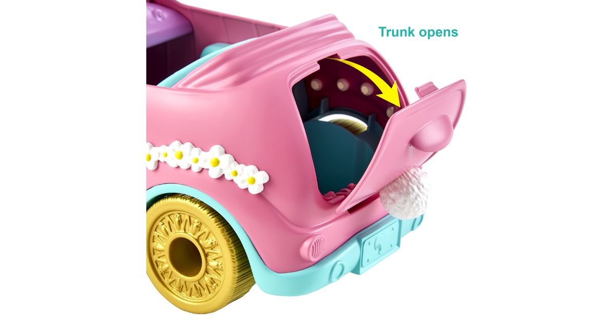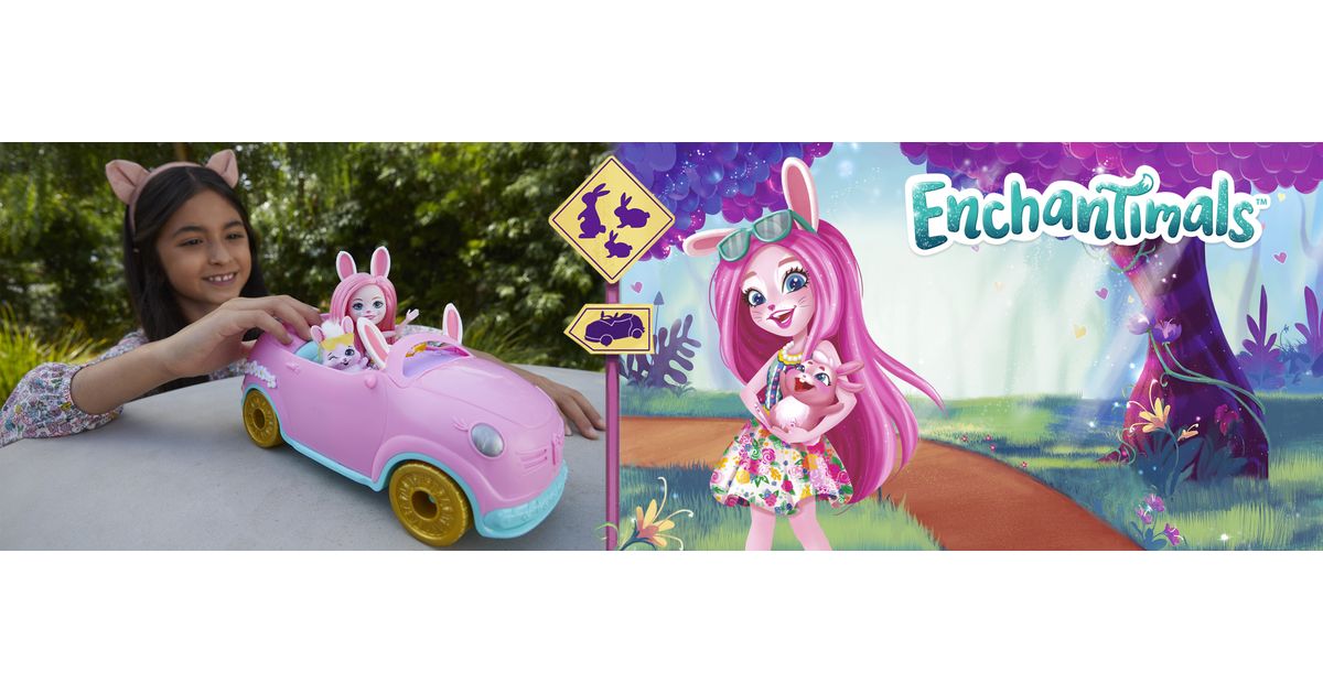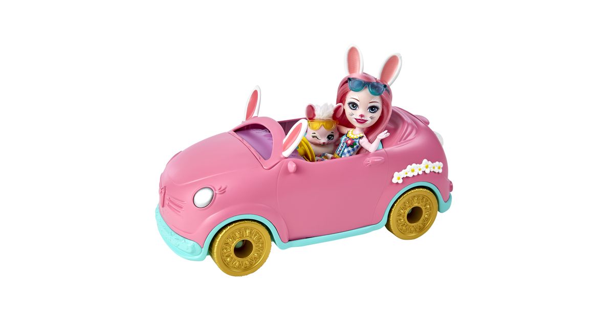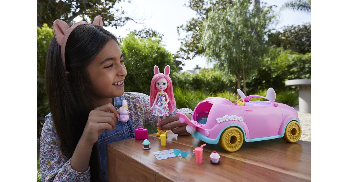 Hop in the Enchantimals™ Bunnymobile! With rolling wheels, a trunk that really opens, and cute bunny details -- this convertible is made for road trip adventures. Bree Bunny™ doll (6-inch) and Twist™ are ready to hit the road with their suitcase, sunglasses, map, drink bottles, and more! Kids will love playing out adventures with this Enchantimals™ 10-piece Bunnymobile doll set. Just push to start the fun! Colors and decorations may vary.