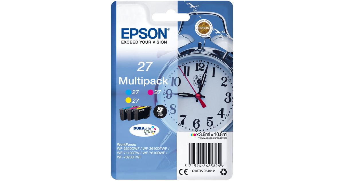 Epson Alarm clock Multipack 3-colour 27 DURABrite Ultra Ink, Pigment-based ink, 3.6 ml, 300 pages, 1 pc(s), Multi pack