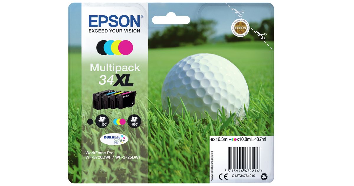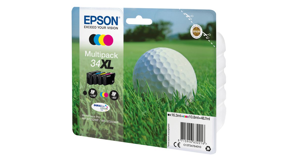 Epson Golf ball Multipack 4-colours 34XL DURABrite Ultra Ink, High (XL) Yield, Pigment-based ink, 16.3 ml, 10.8 ml, 1 pc(s), Multi pack
