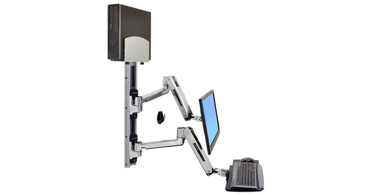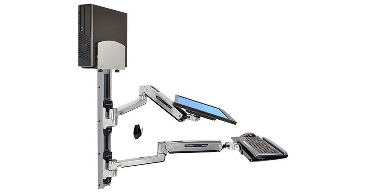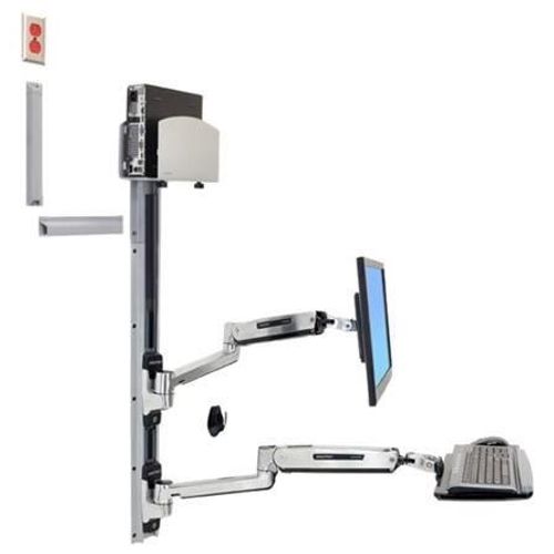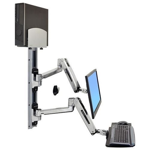 With Medium Silver CPU Holder. This is a complete solution that accommodates an LCD, keyboard and CPU, creating a sit-stand computer workstation. It is perfect for space-constrained areas: simply fold the keyboard and LCD tight against the wall when not in use.